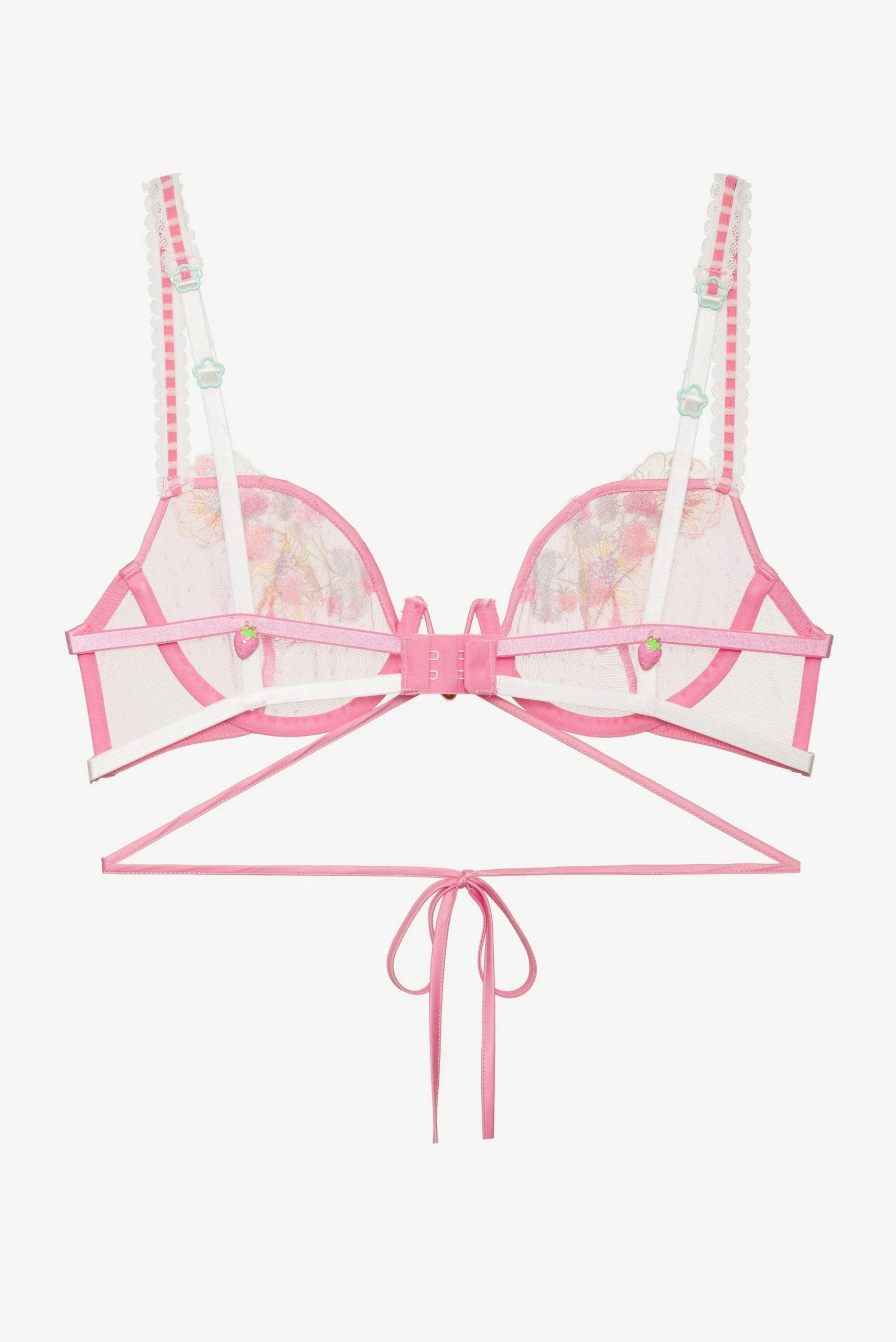 Freshly picked for you, this sexy-sweet piece features berry-patch appliques and an enamel strawberry charm combined with slotted-ribbon straps and a satin tie around the torso.