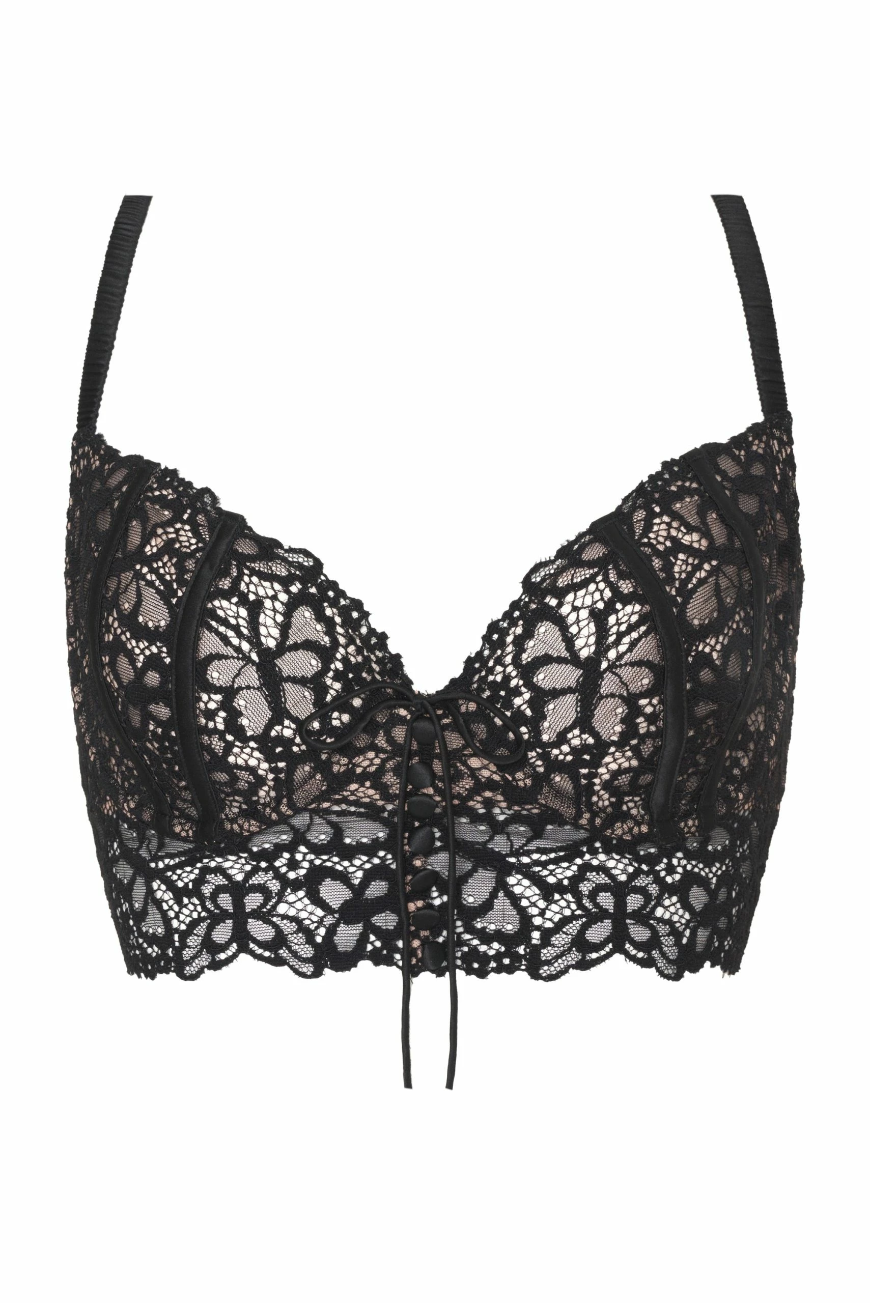 Butterflies sweep across this luxe lace design finished with covered button detail and a skinny center bow.