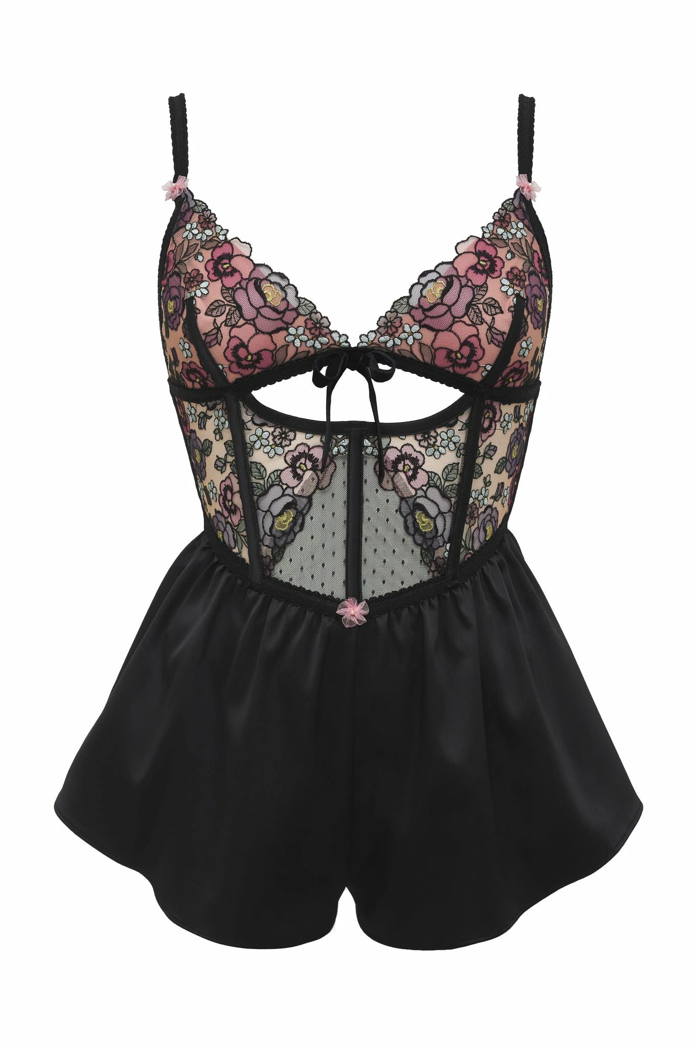 You like florals with a dark side? This sultry onesie combines moody, embroidered blooms with flirty satin tap shorts.