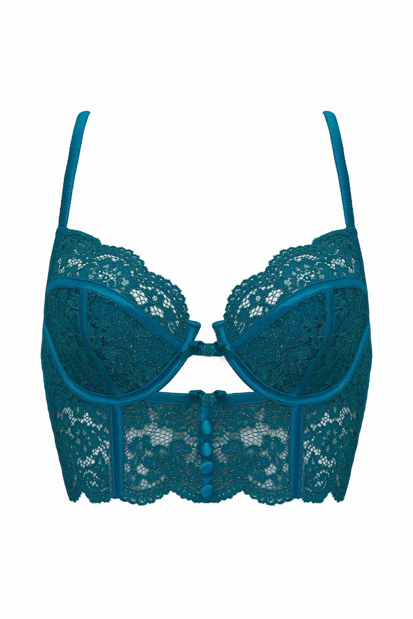 As refreshing as the ocean – this teal bustier serves up scalloped lace combined with pretty bows accents and satin-covered buttons. The keyhole cutout and strappy cage back add a racy edge.