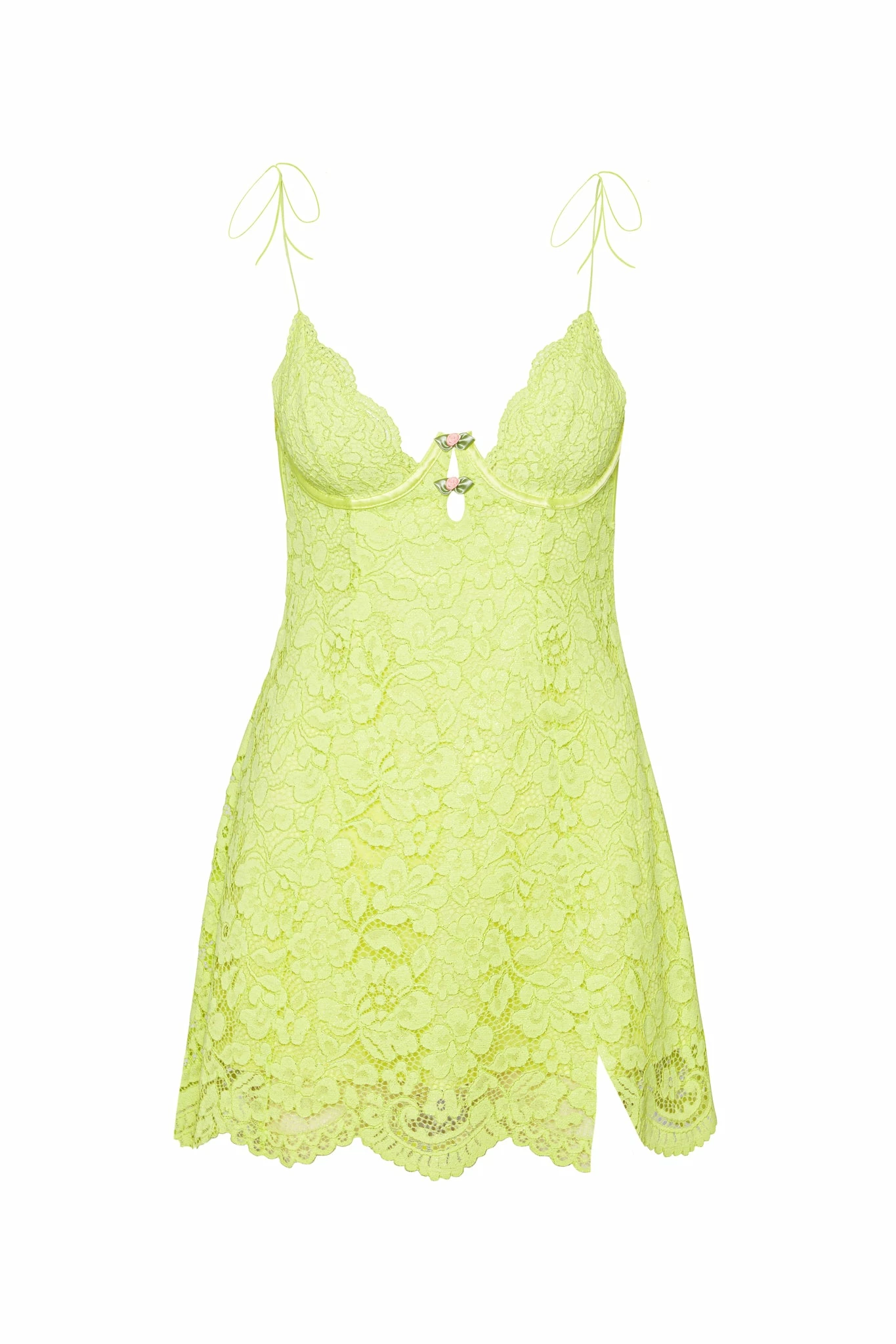 As refreshing as a scoop of mint ice cream—this mint green slip serves up romantic, scalloped lace combined with ultra-skinny tie straps and rosette accents. What makes this dress not so girl-next-door are its mini length, saucy slit, and built-in underwire bra with a cutout back.