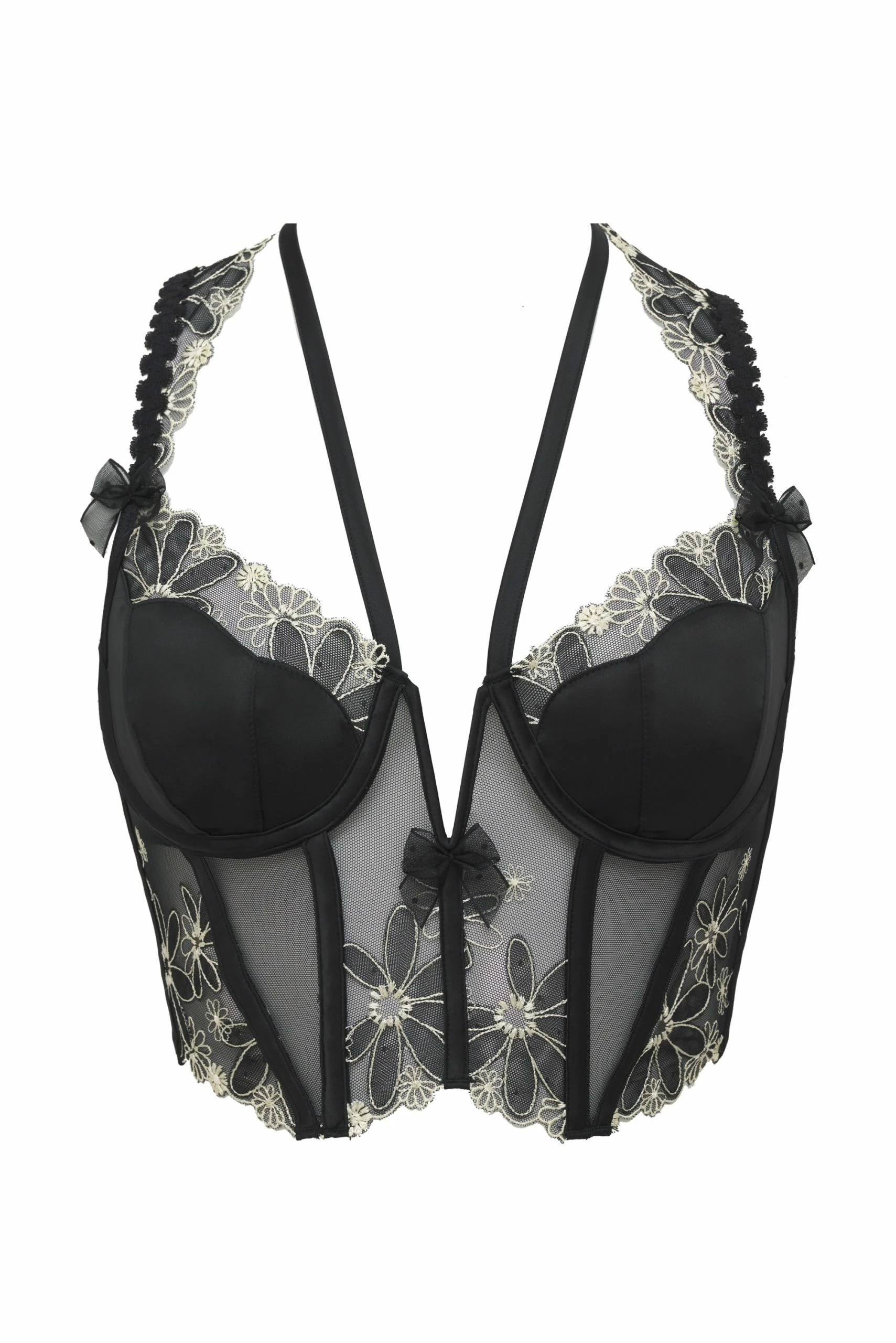 Discover the darker side of daisies in a vampy black corset top embroidered with sweet yellow blooms. Featuring sheer mesh panels and a plunging V-wire between the satin cups. Pair with the matching panty and garter belt.
