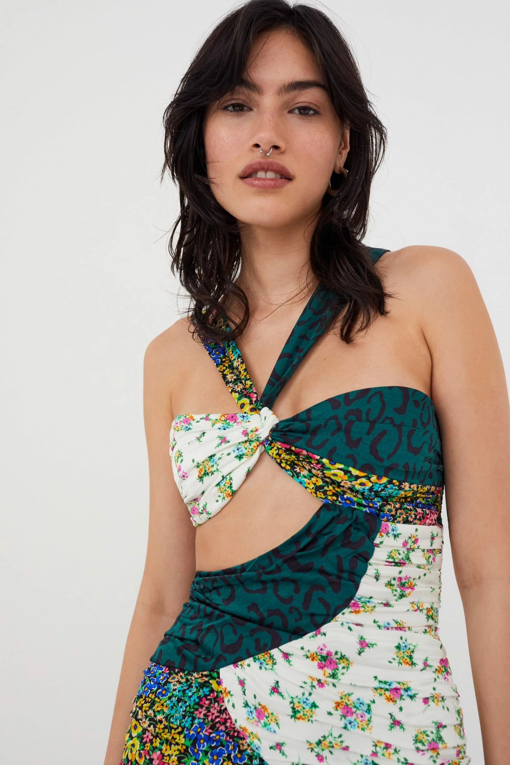 Mixed print asymmetrical mini dress with gathered panels along body and cut-out from to back waist.