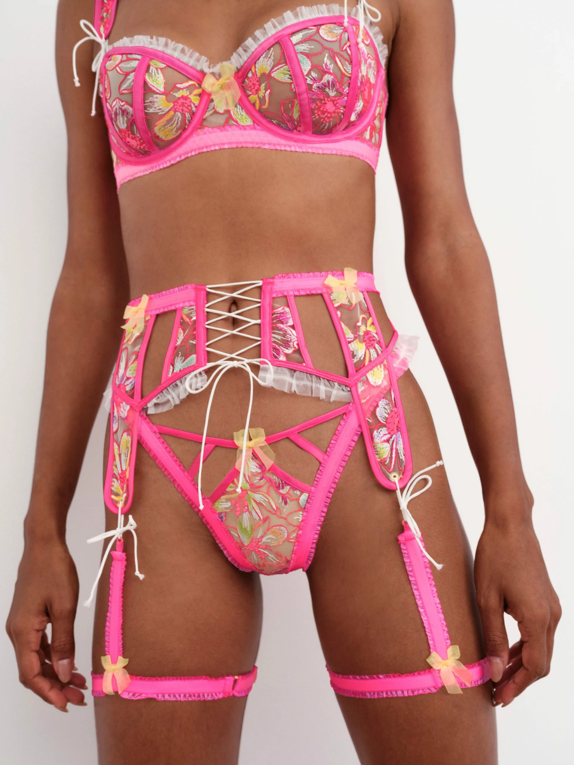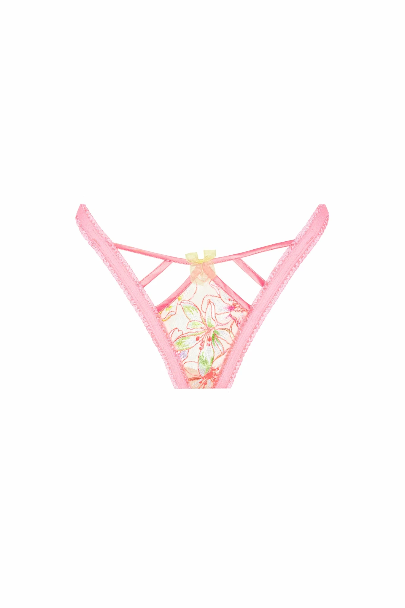 Sweet organza bows finish an alluring thong featuring keyhole cutouts and delicate floral embroidery. Perfect paired with the matching Electric Fields bra.