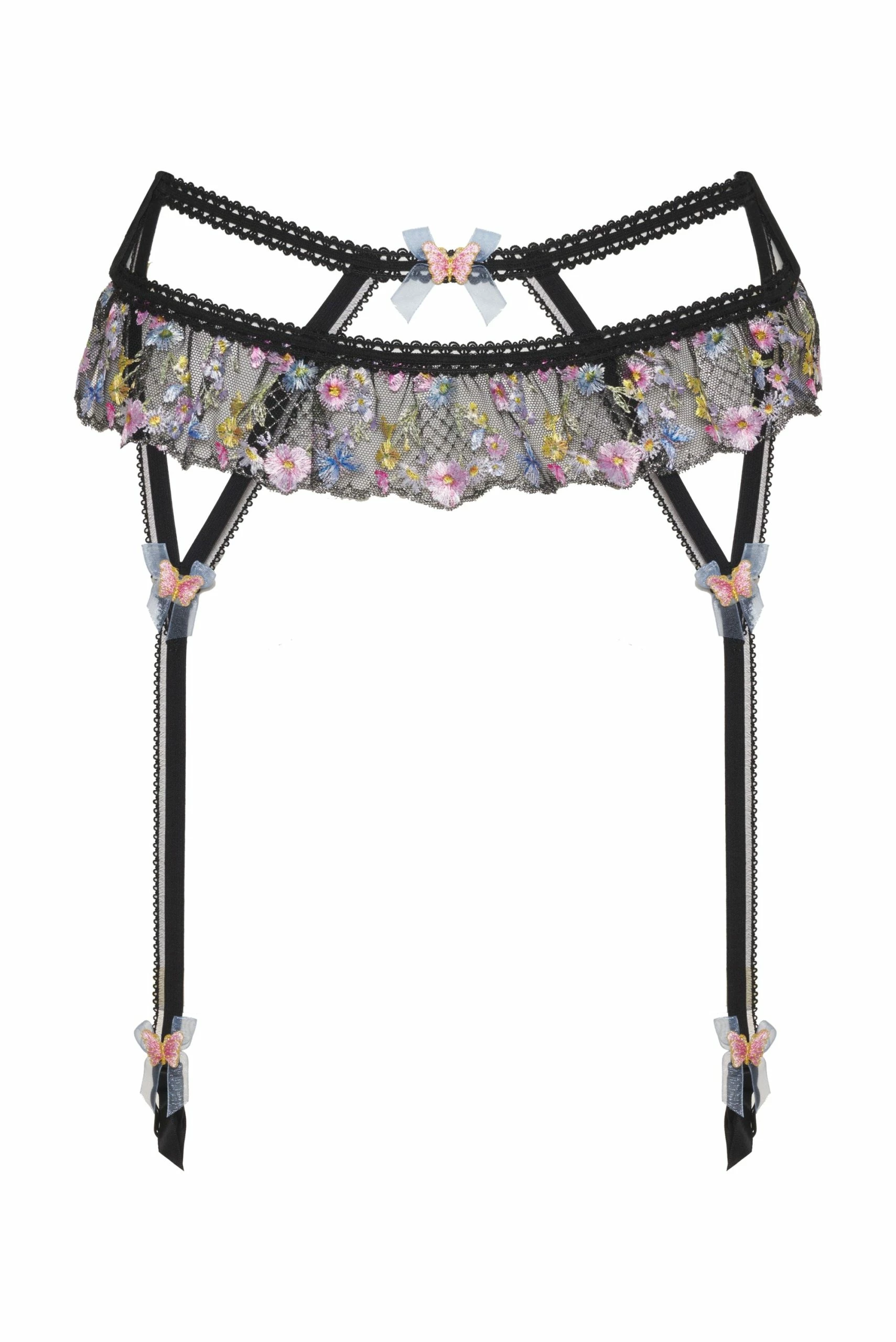 Defined by cutout detail and intricate floral embroidery, this piece is a standout in your lingerie collection. Delicate organza bows with butterfly accents complete the piece.