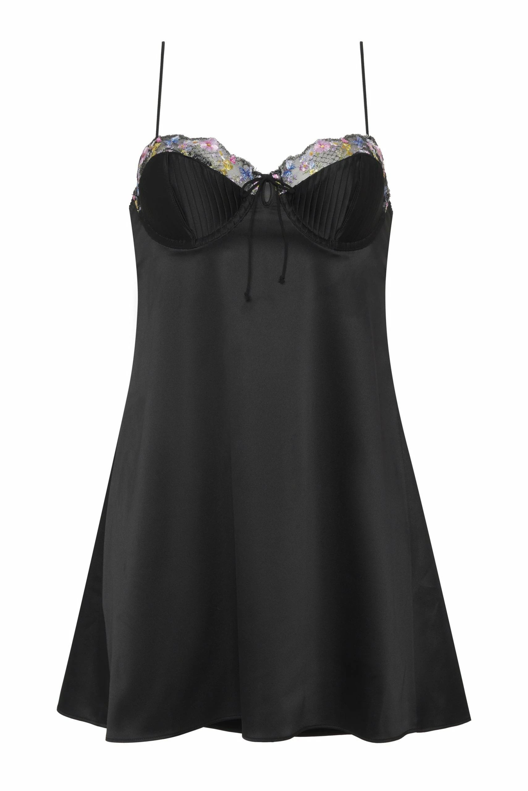Defined by pleated cups and intricate floral embroidery, this silky slip exudes ethereal charm. Delicate bow details and an open keyhole back complete the piece.