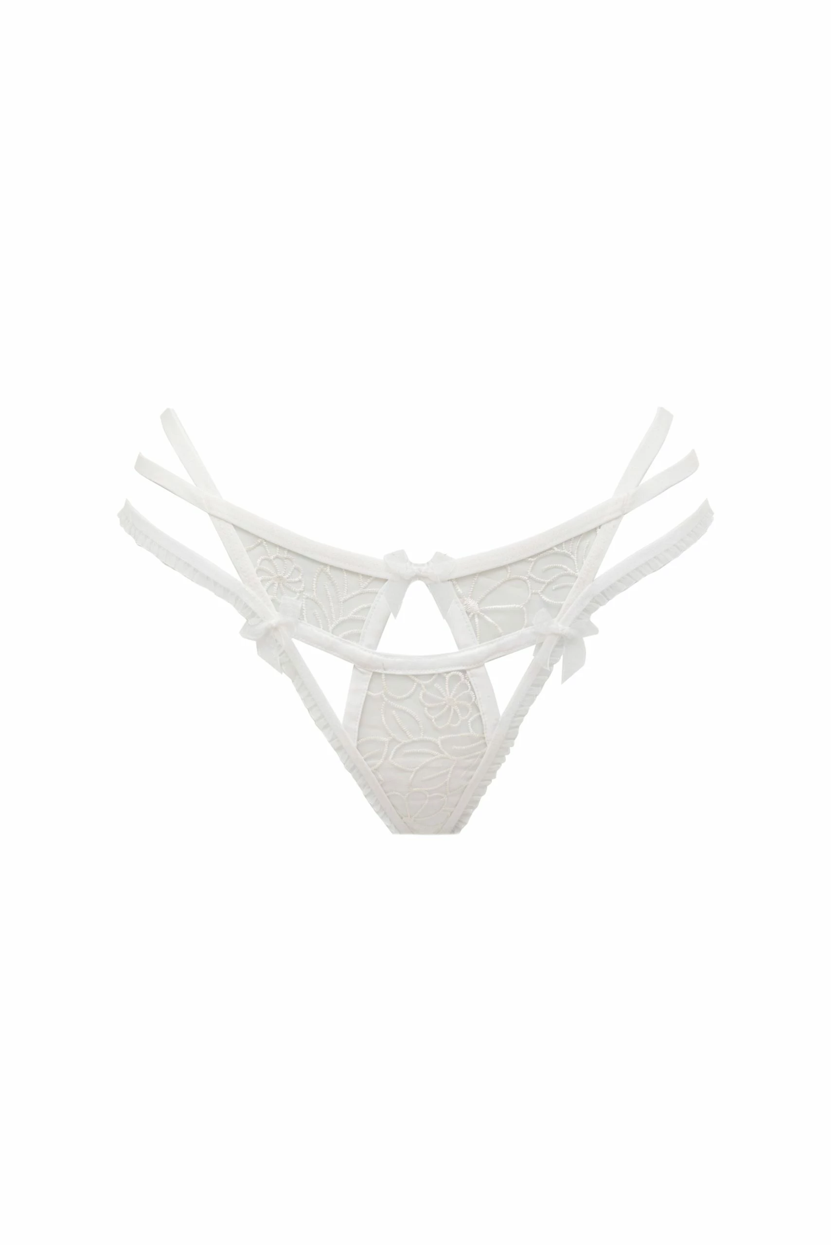 Catch the right balance of sweet and sexy in this pretty thong featuring embroidered organza plus strappy cutouts and sides. Perfect paired with the matching bustier top.