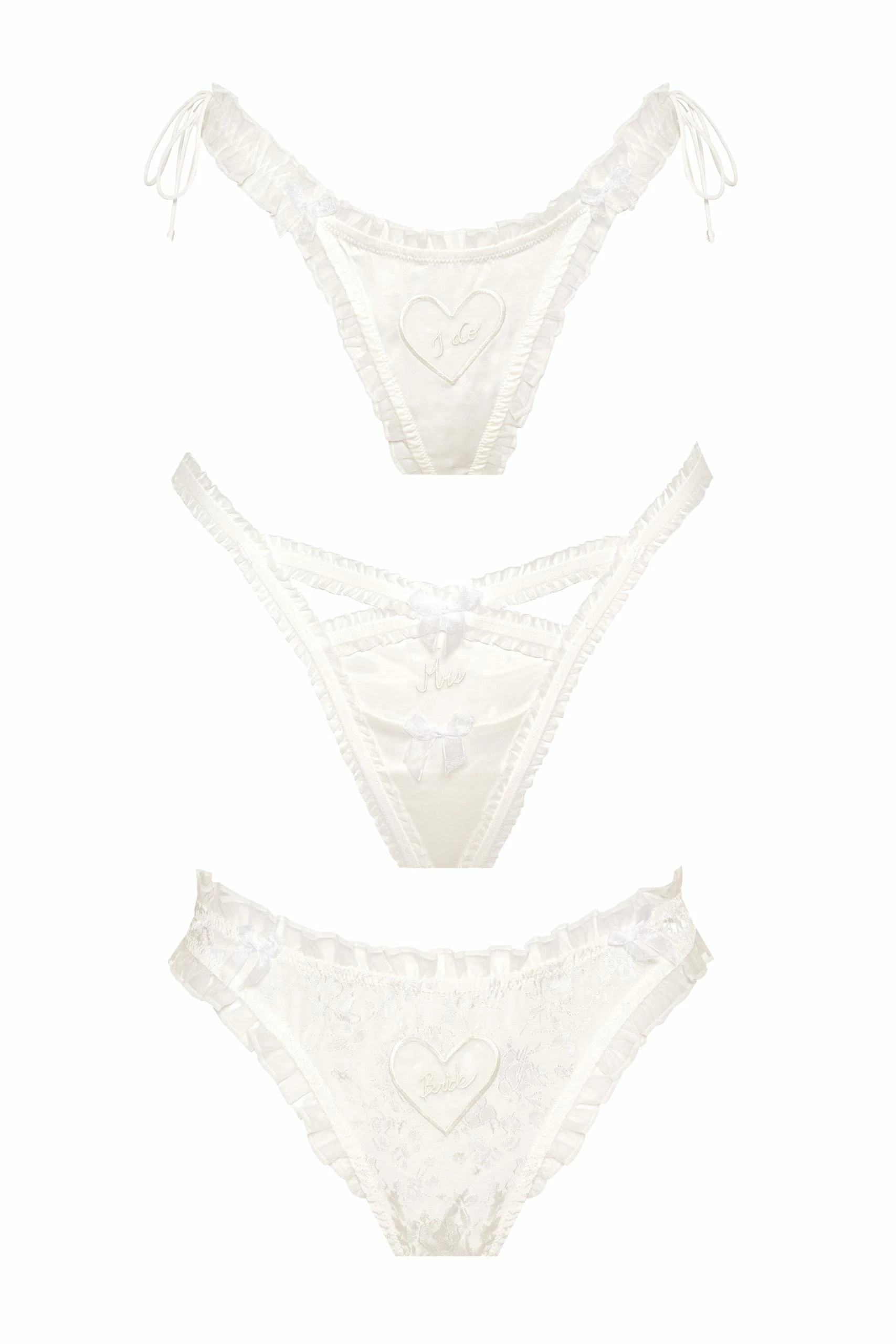 From the ceremony to the honeymoon and beyond, this trio of embroidered panties says it all.