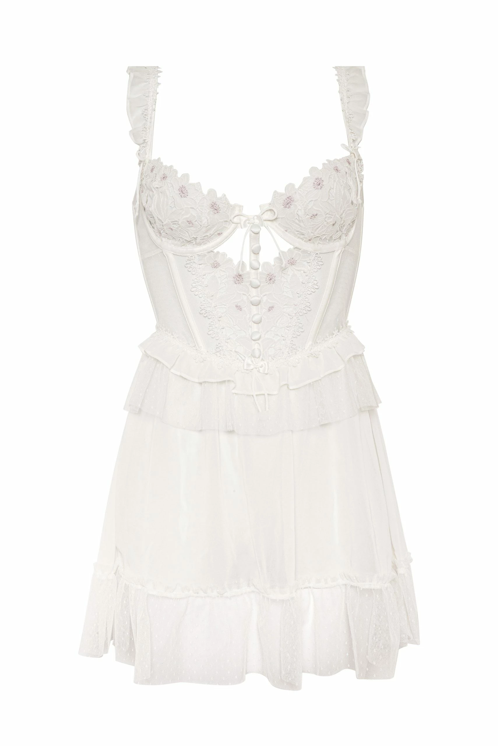 For your big day (or night) and whenever you’re feeling fancy, this lacy, pure-white piece is a showstopper. Finished with a romantic tiered skirt, covered button details, and ruffles at the straps and waist.