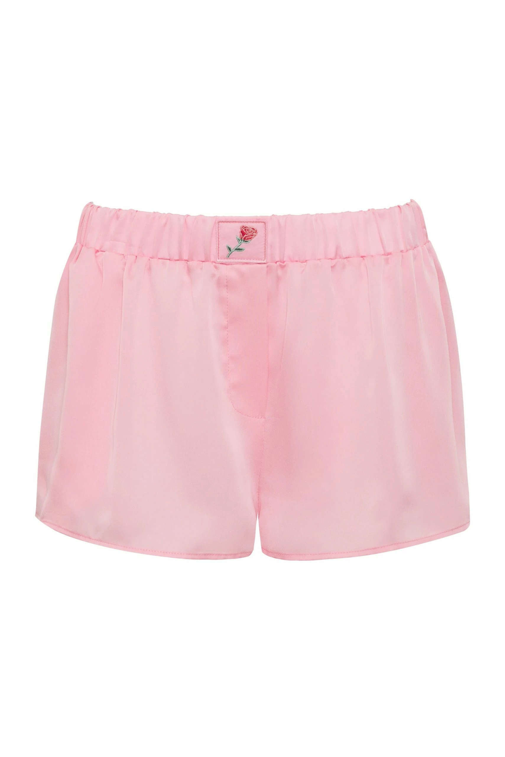 Comfy never looked so cool. Smooth satin gives this relaxed pair a flirty feel. Finished with a faux fly front with rose embroidery, back patch pocket, and wide elastic waistband.