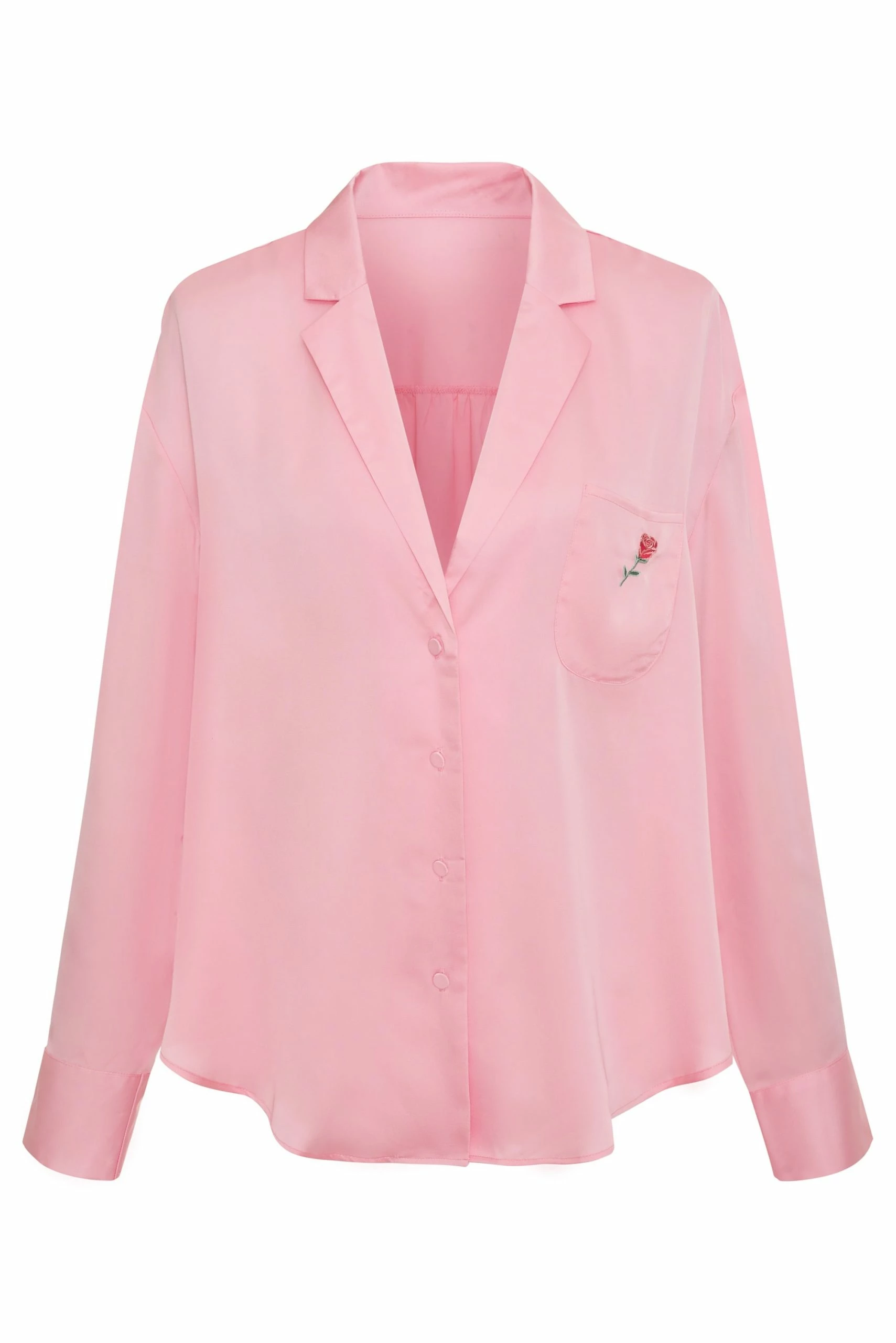 Comfy never looked so cool. Smooth satin gives this oversized style a flirty feel. Finished with a rose-embroidered patch pocket, notched collar, and covered buttons.