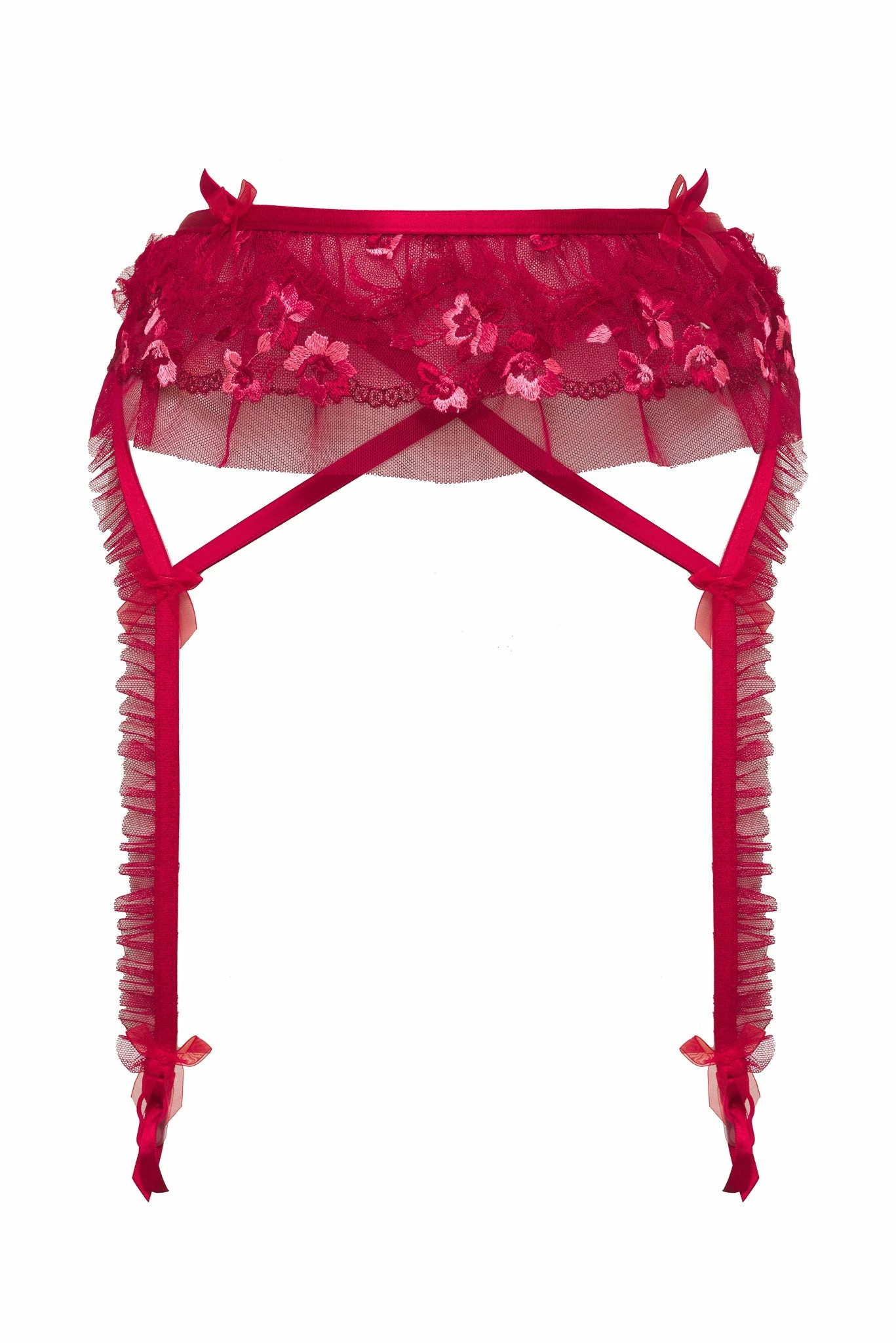 Lady in red. This saucy style invites your favorite pair of thigh highs with its garter straps and clips. Scalloped lace and tulle ruffles give it a skirted look.