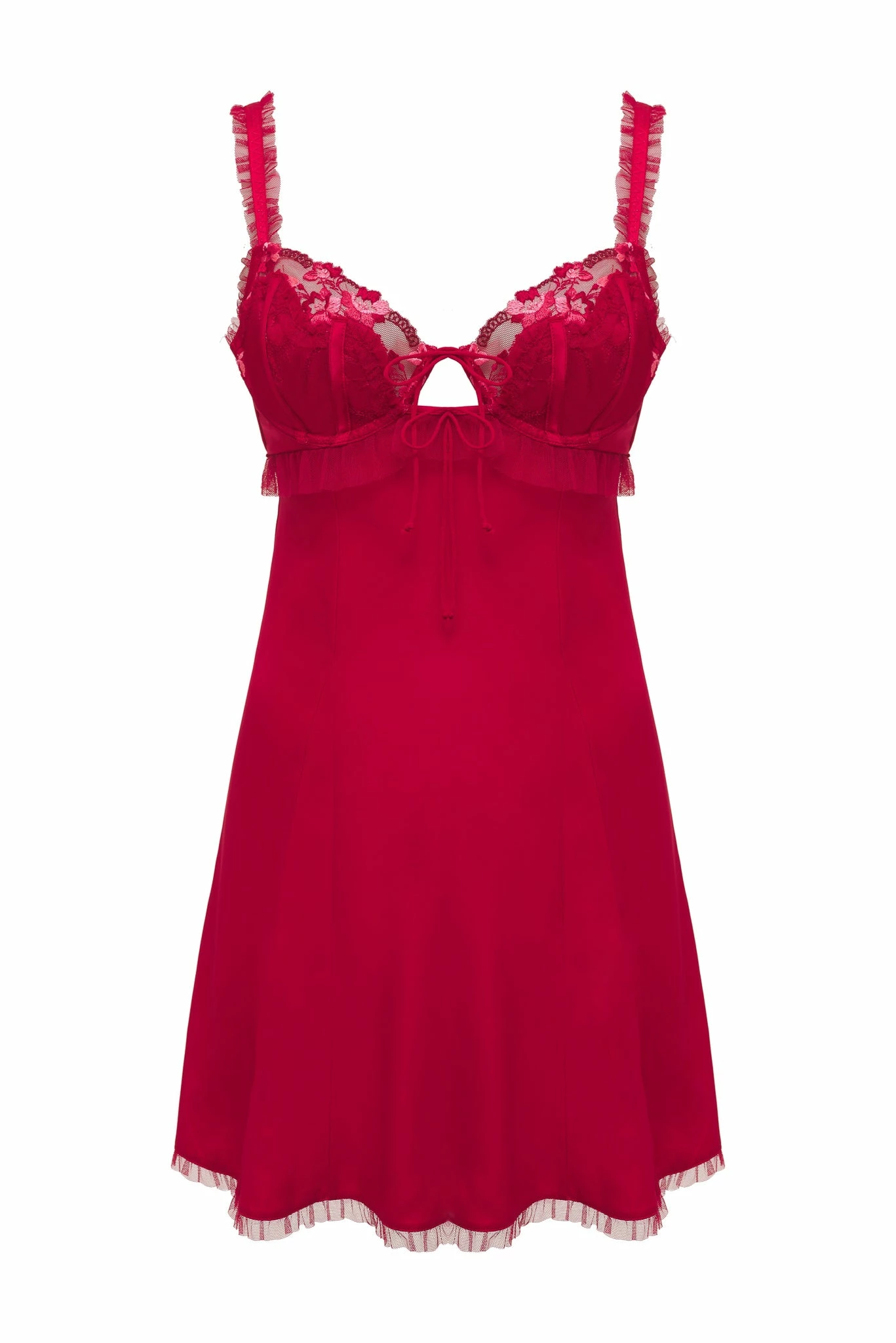Lady in red. This saucy slip is all about embroidered satin, ruffled tulle, and a skinny tie detail between the cups.