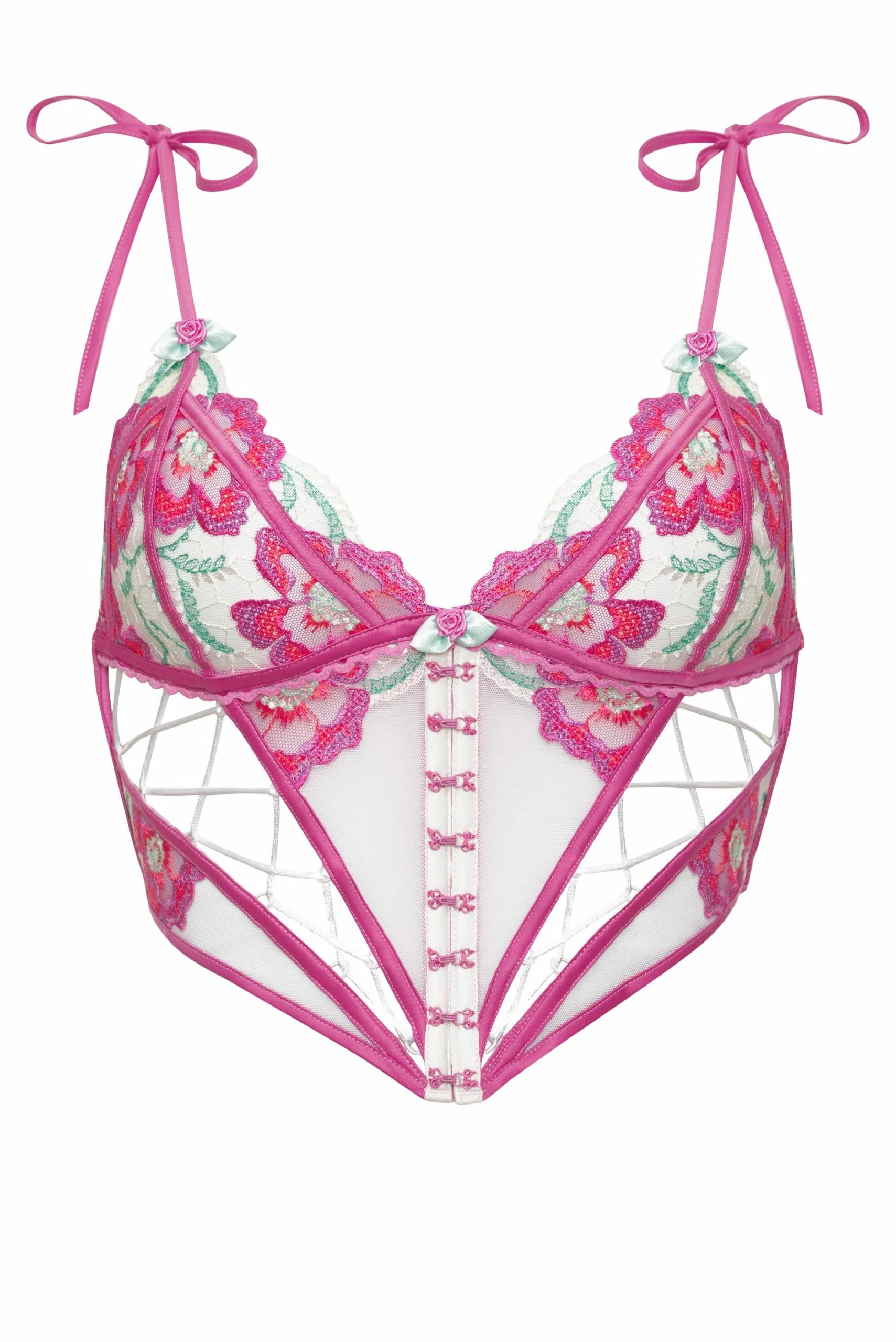 Floral embroidery blooms brightly on this concert-ready top. Triangle styling is supported with underwire and finished with tie straps, lace-up side details, and mini rosettes.
