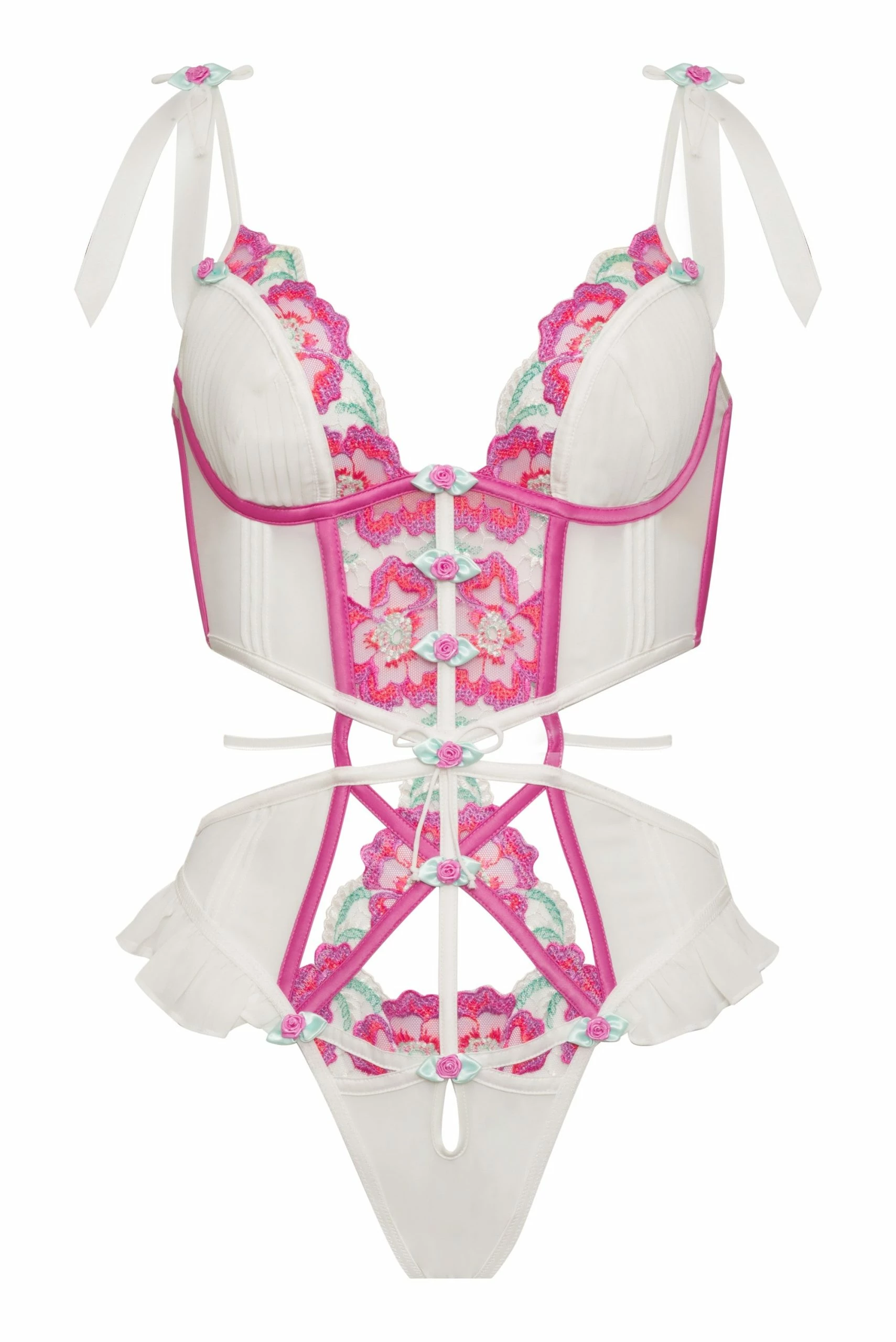 Ready for the spotlight, this femme one-piece is decked out with floral embroidery, pintucked chiffon panels, and wide ribbon straps.