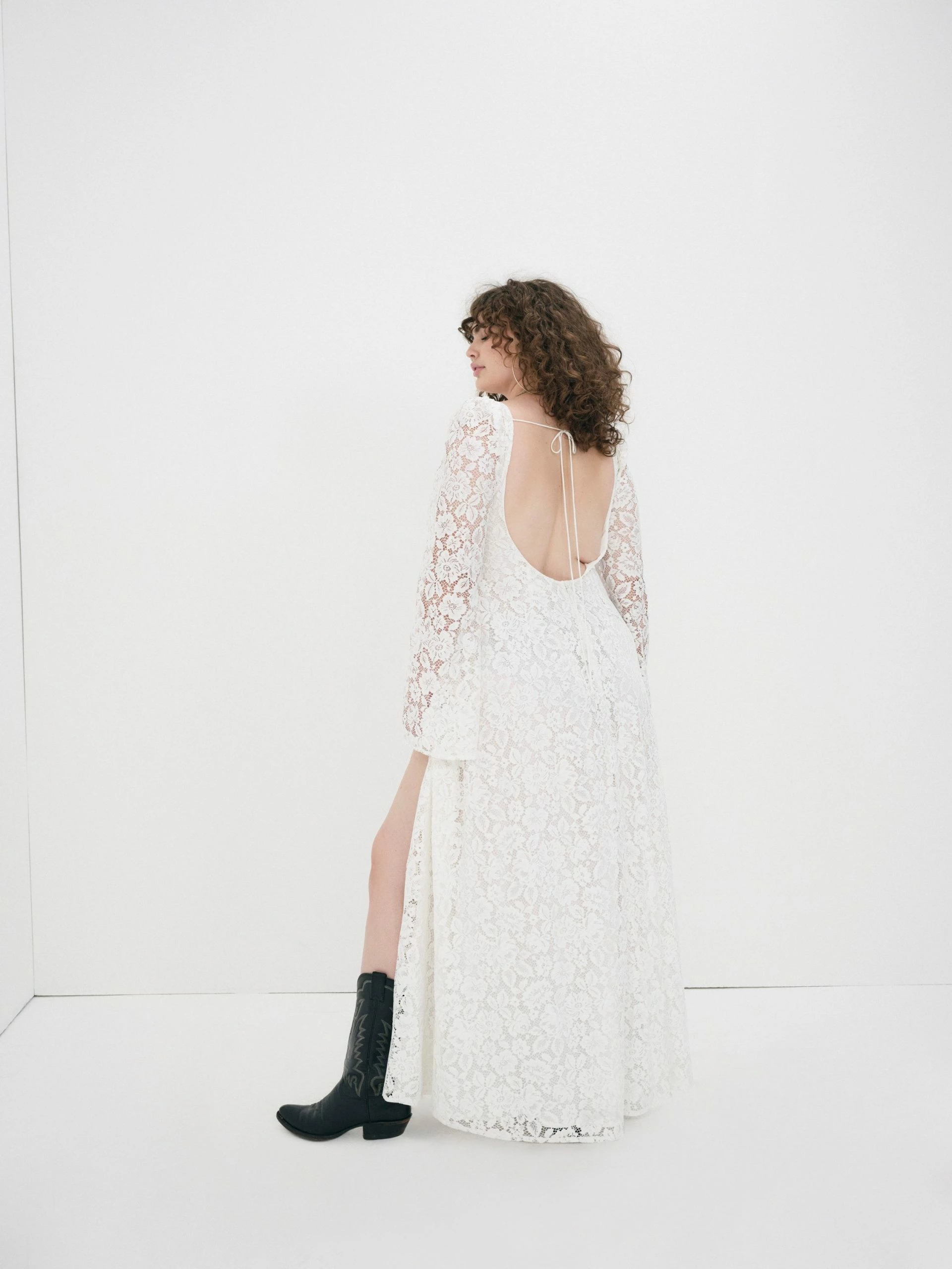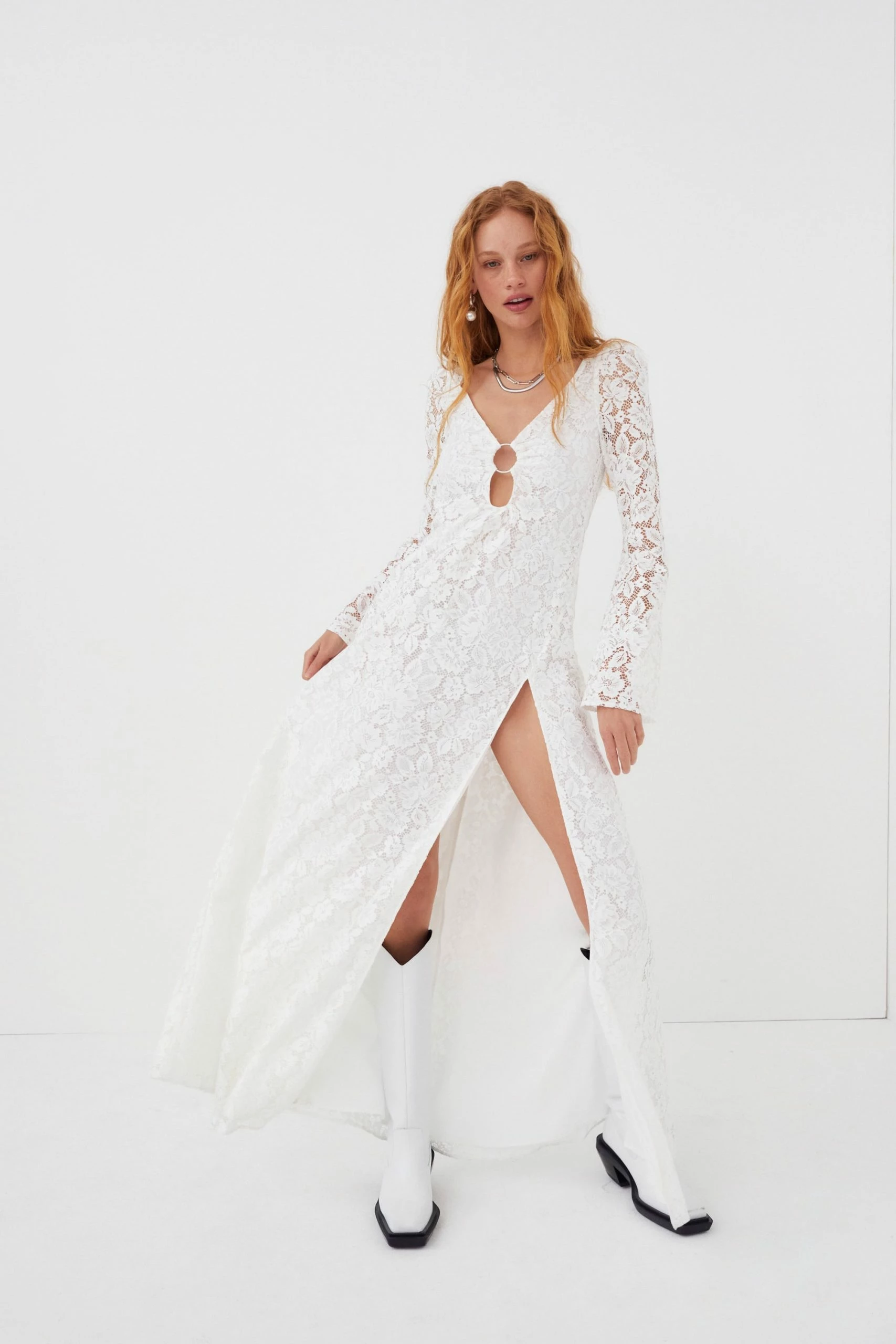 Gardenia lace maxi dress with bell sleeves and deep V neckline with metal ring detail above keyhole at waist. Thigh-high slit on skirt, and low back with tie across shoulders.