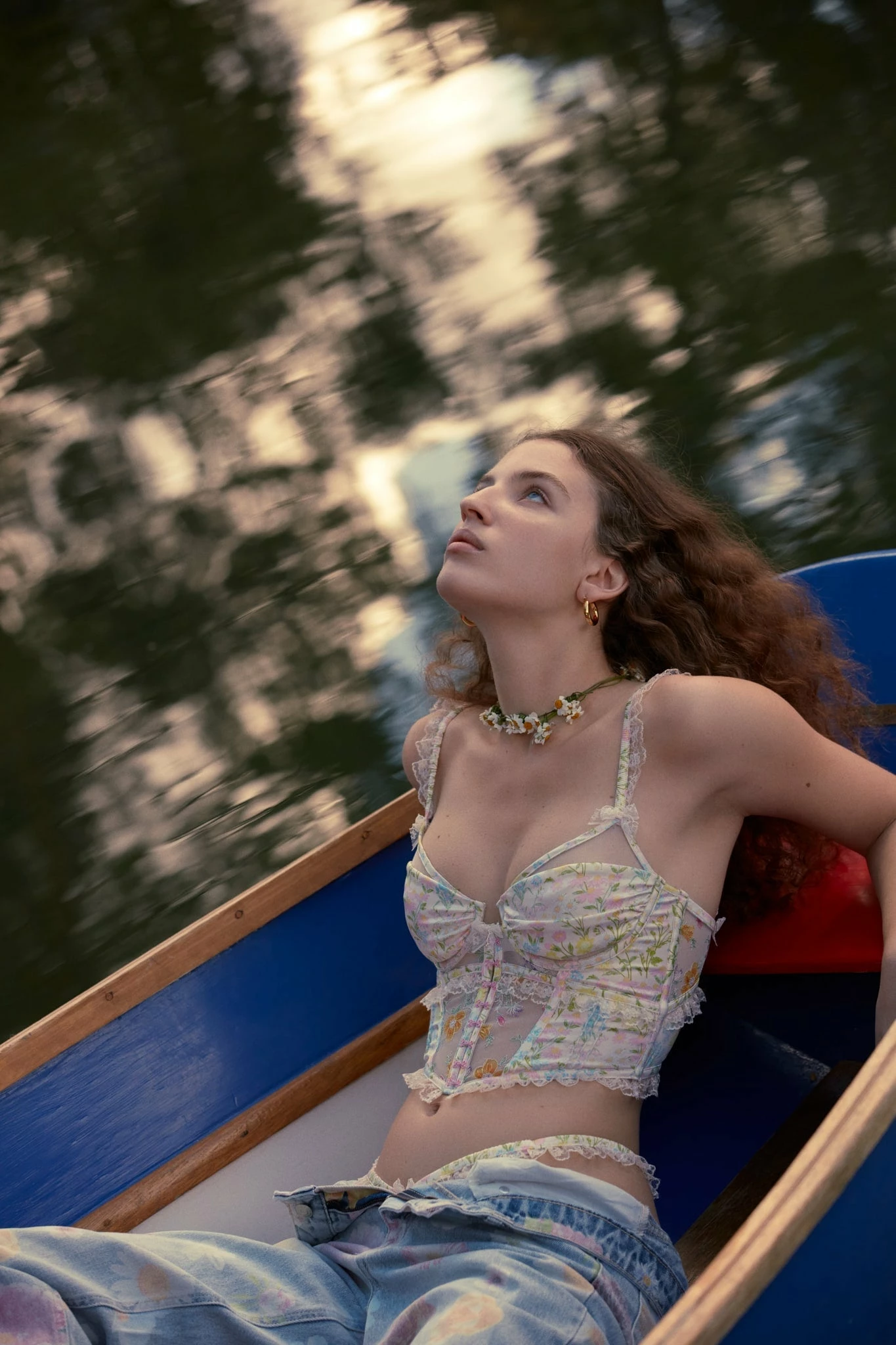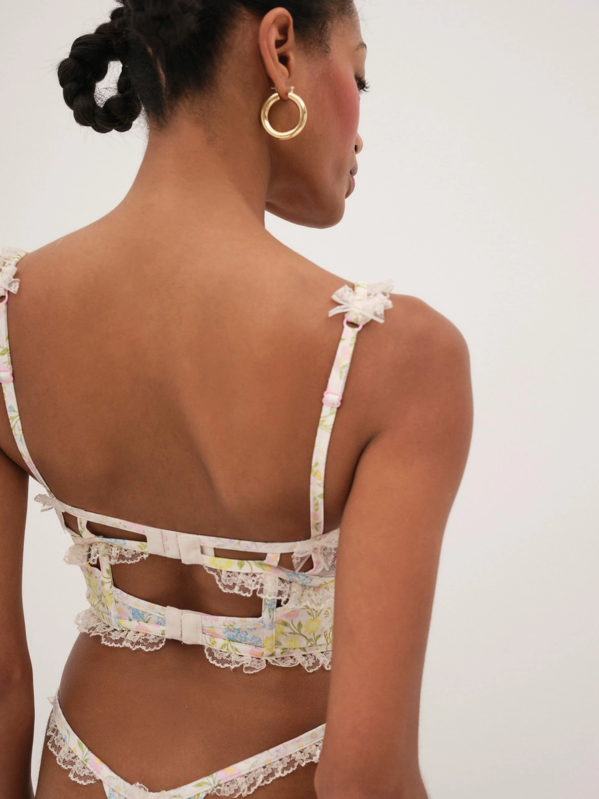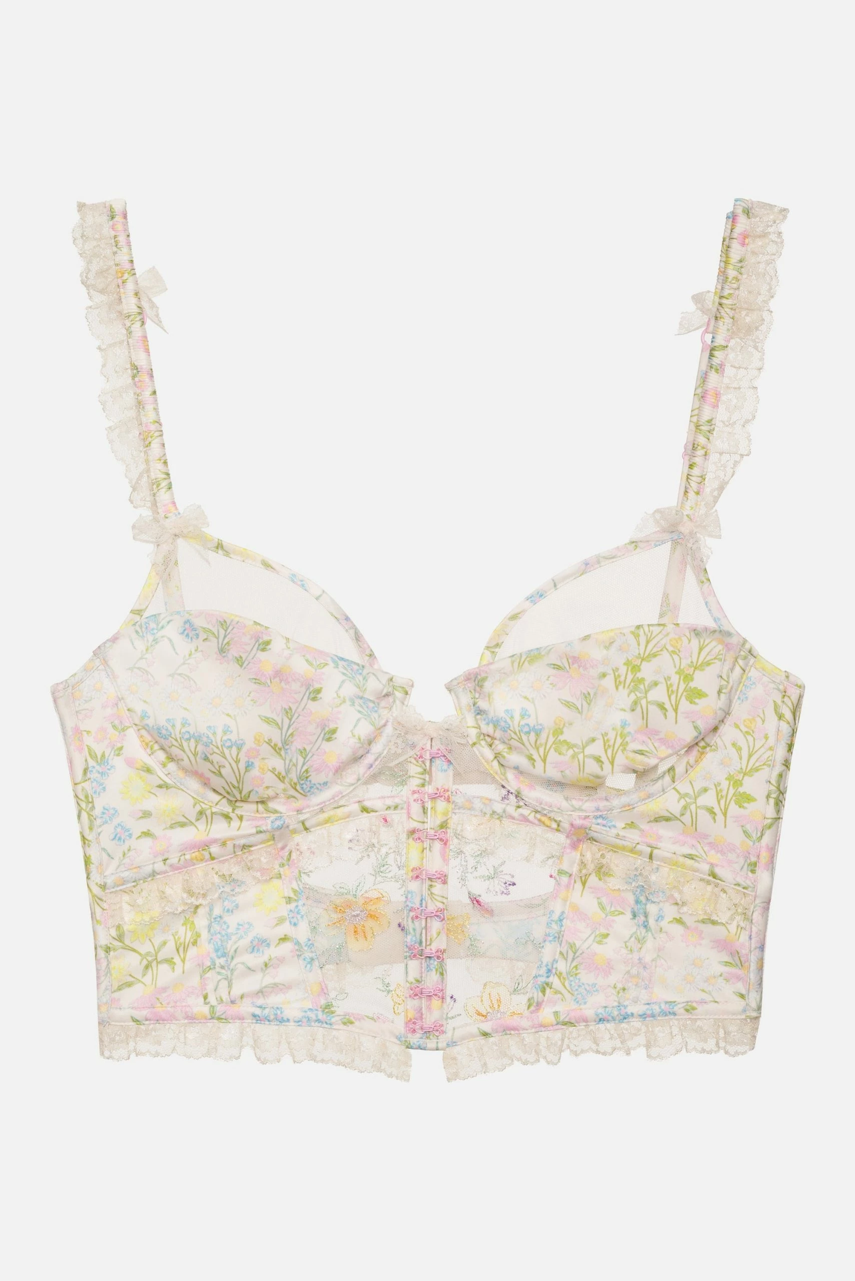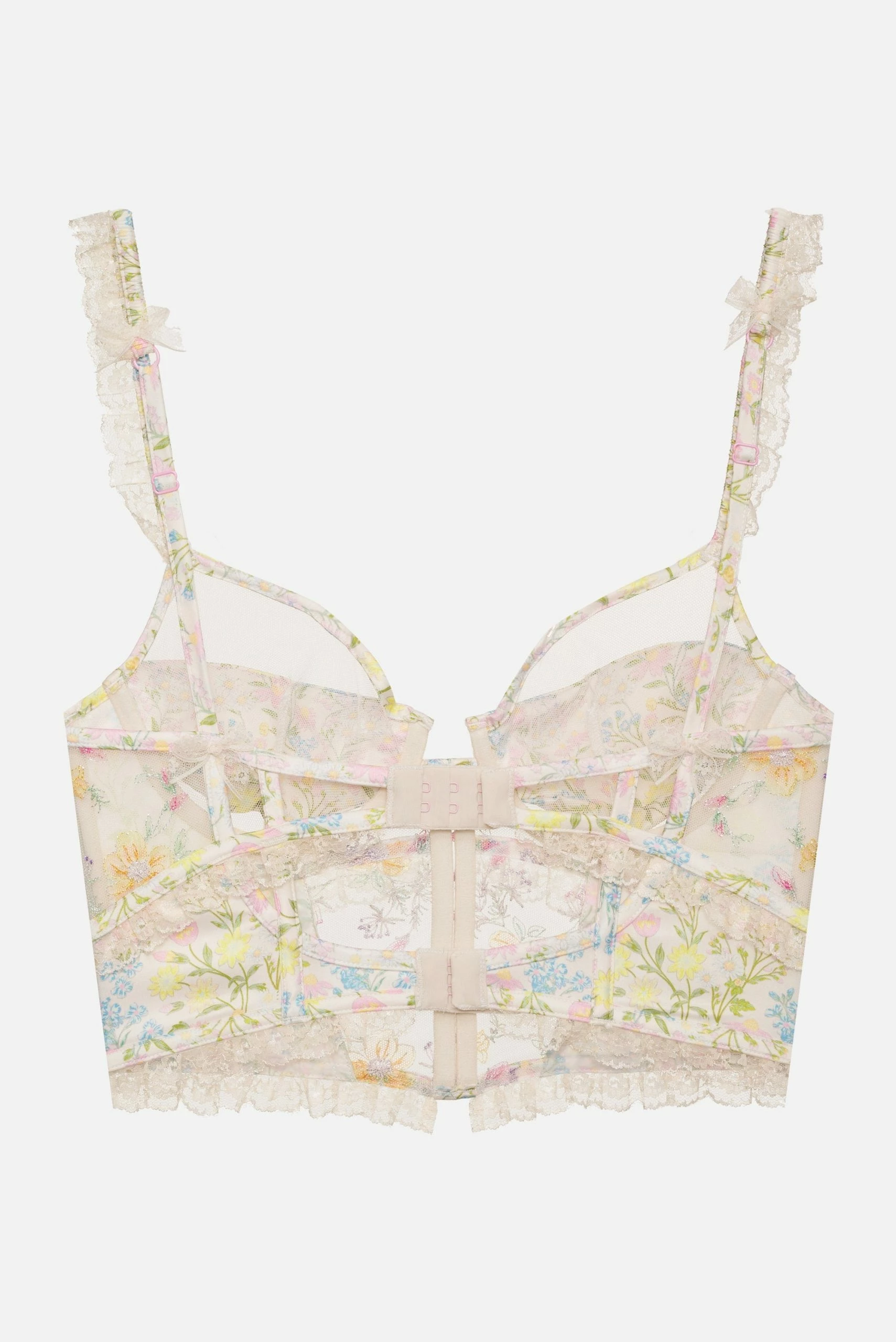 This garden-fresh piece tops off your lingerie look beautifully—and pairs with denim perfectly, too. Features mesh cups with printed satin overlays and doily lace trim.