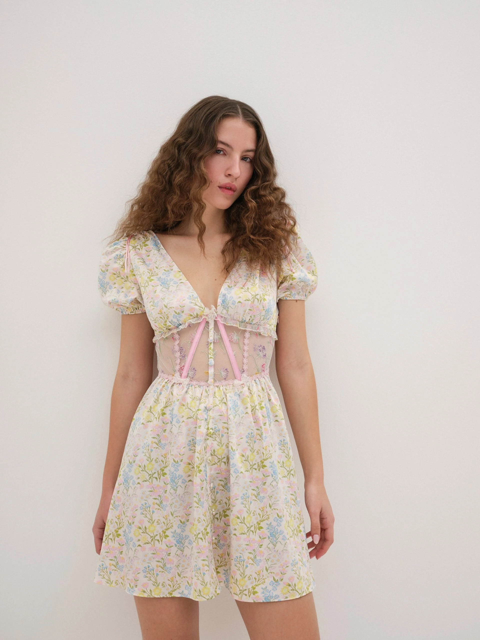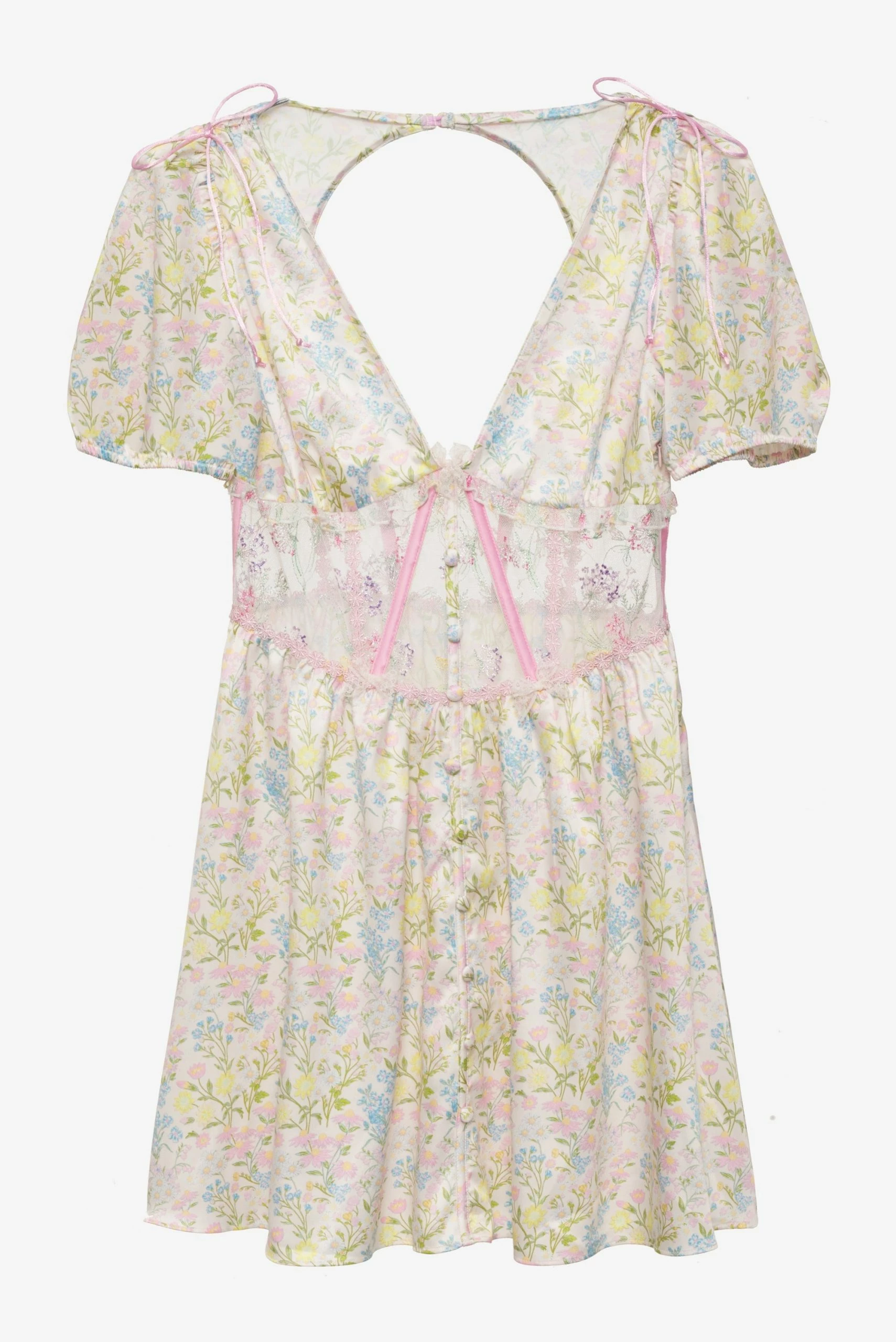 Delicate boning at the sheer waist gives corset vibes to this ultra-femme dress. Puff sleeves, dainty ruffles, and a large back cutout complete this memorable design.