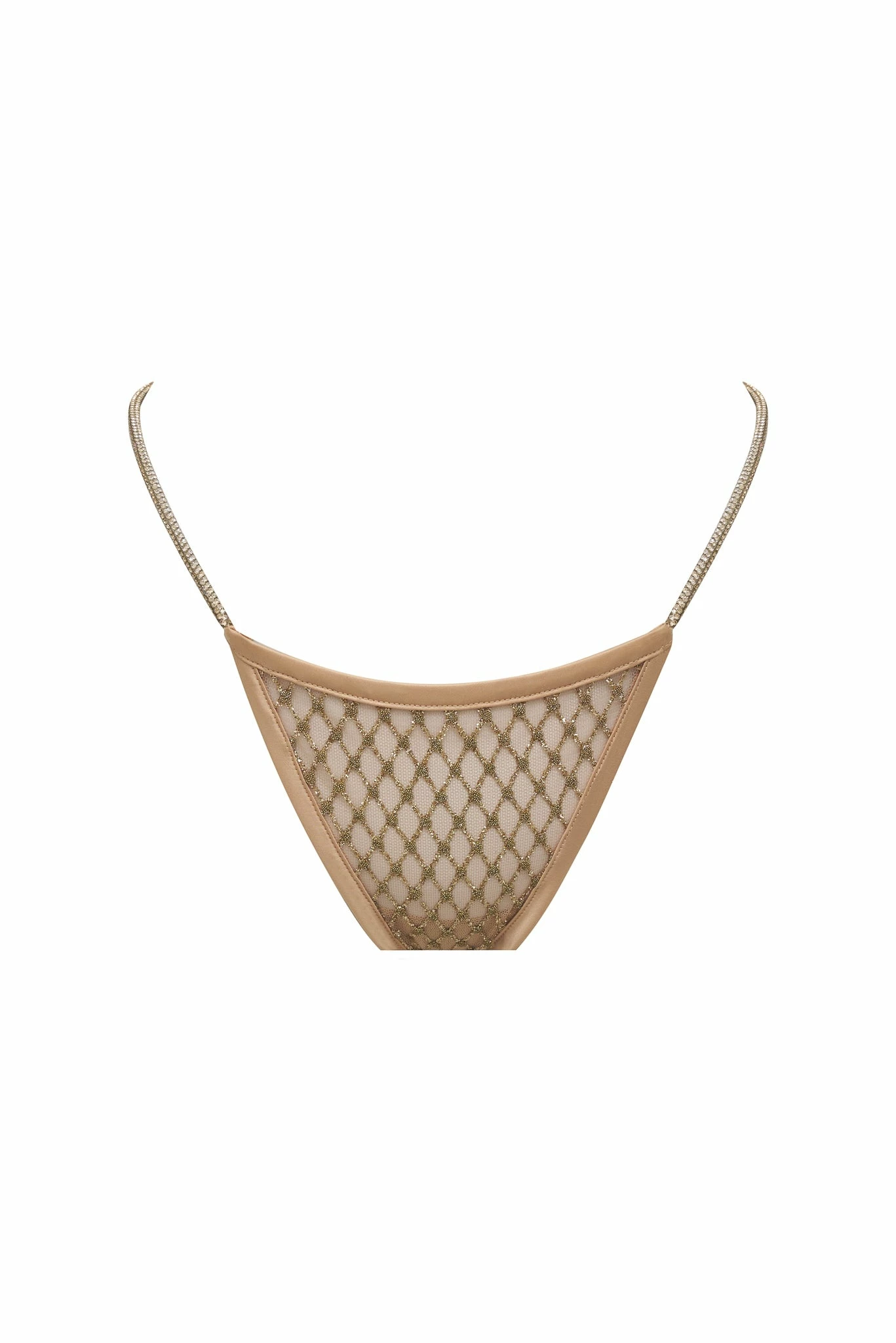 Get caught in a web of shimmery gold. This minimal string thong is covered in metallic netting, and trimmed with tiny diamante crystals at the straps.