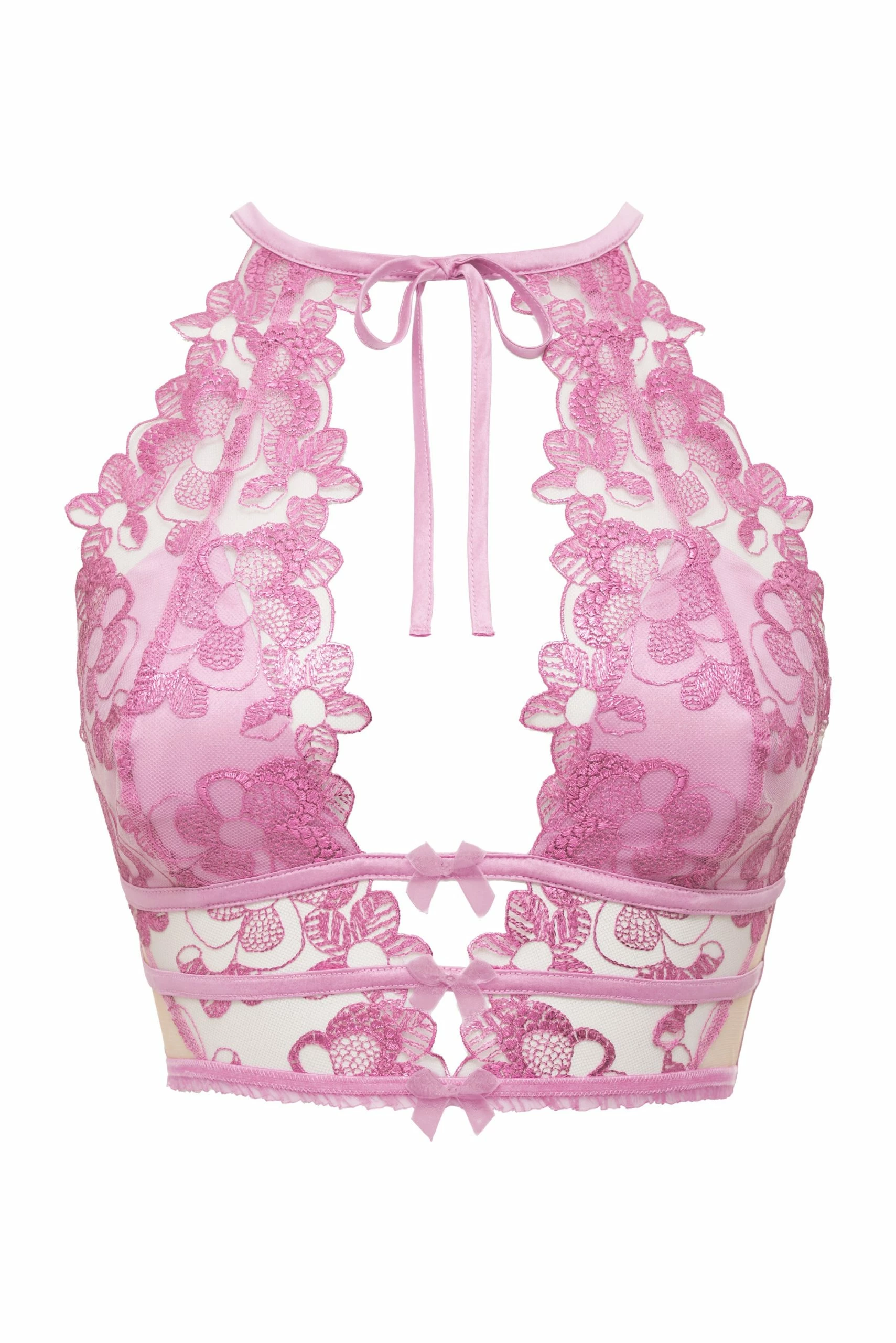 A study in gorgeous watercolors and floral embroidery—this ultra romantic bra features soft triangle cups, subtle cutouts, and a ribbon in back. Finished with crystal flower buttons for extra charm.