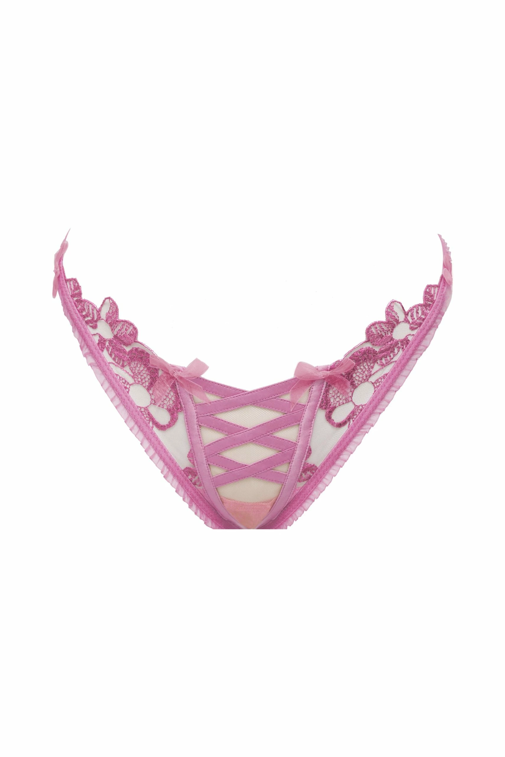 Pink isn’t just a color, it’s an attitude. This beautiful thong showcases the color with shimmery embroidery and organza bows. The strappy cutouts and lace-up detail in front add an edgy touch.