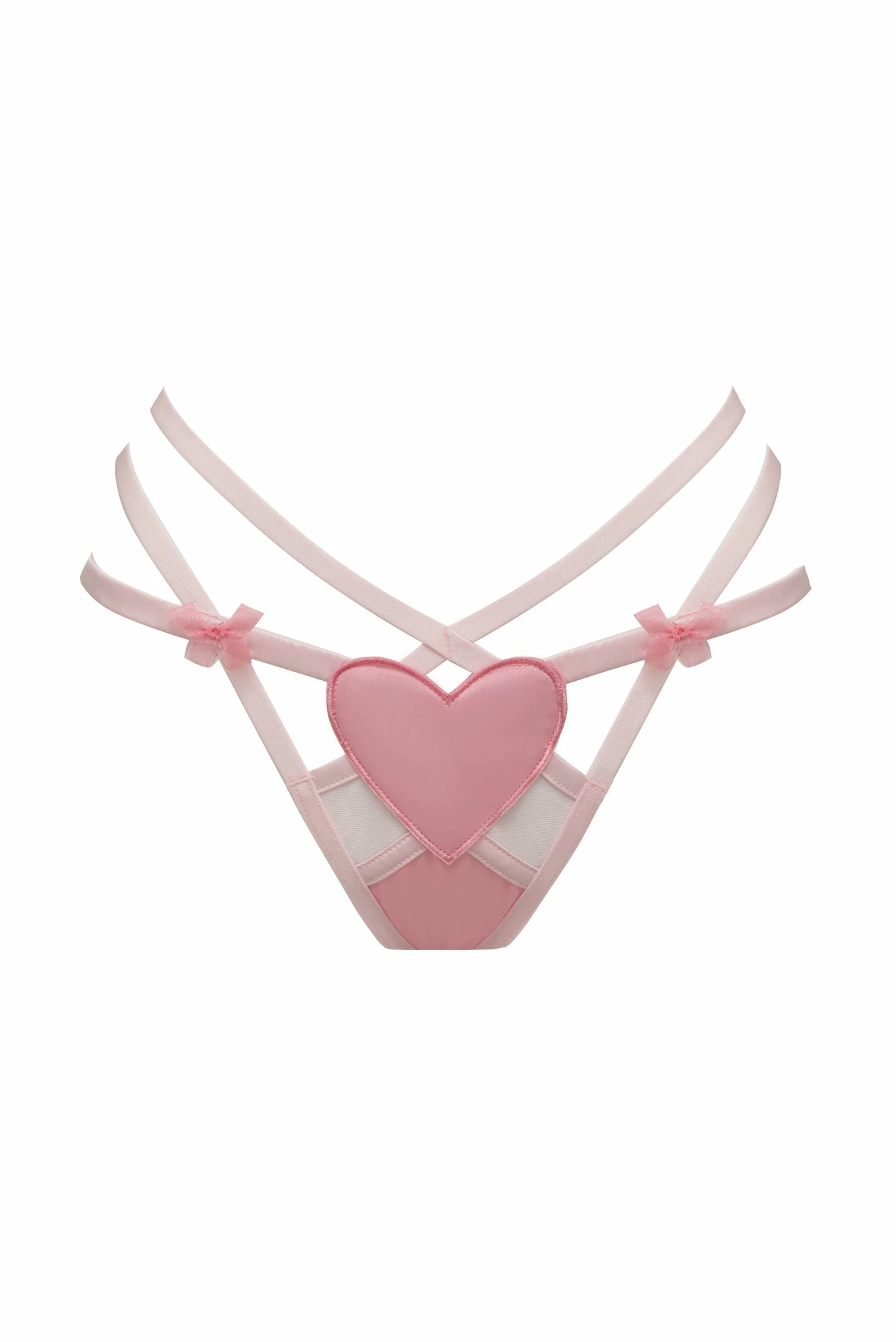 A scattering of pink heart appliques defines this barely-there style that’s a little sweet and a lot sexy. Featuring a strappy waist and organza bows.