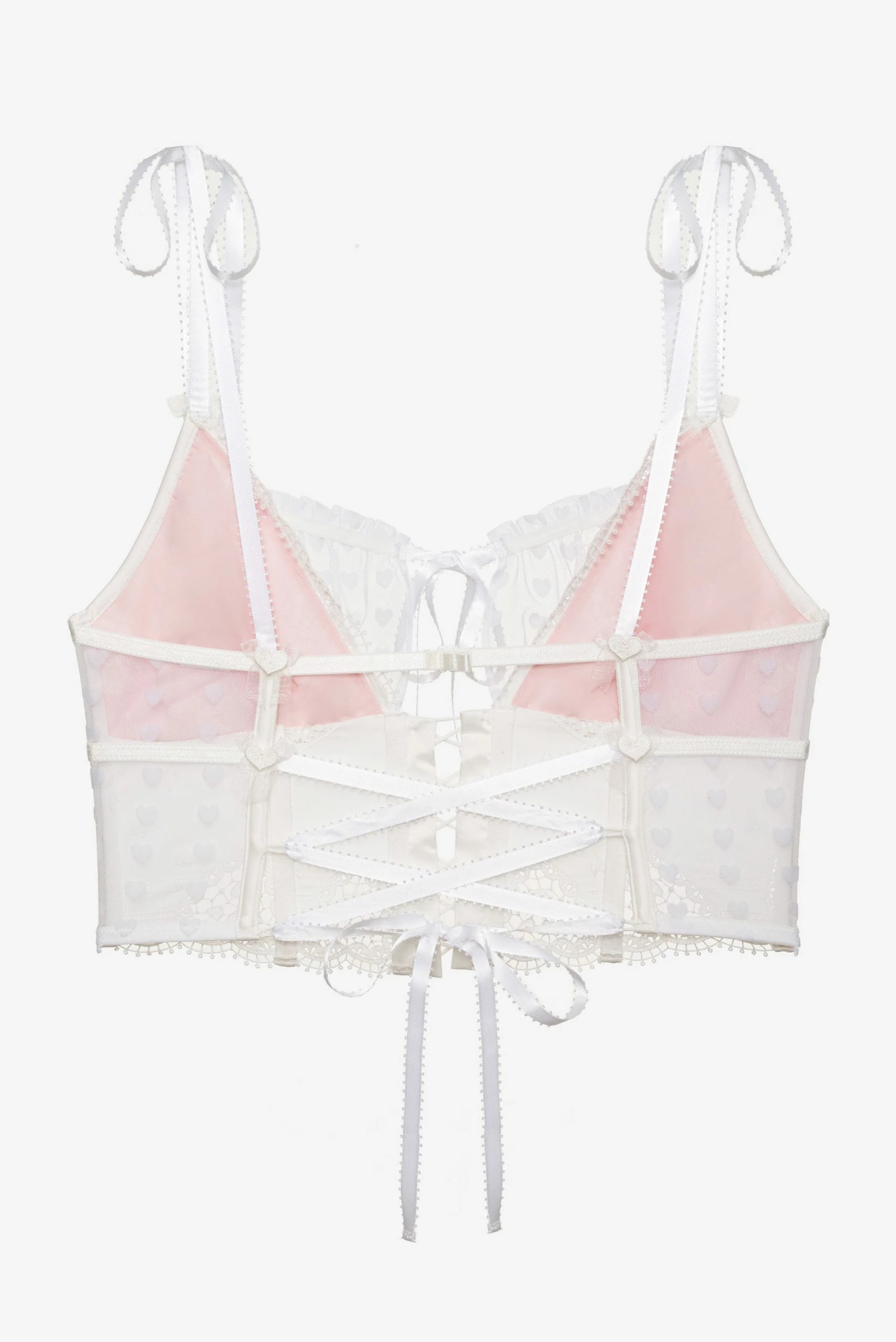 An array of heart motifs adds romantic interest to this must-have piece. Flocked hearts on mesh, organza bows with heart appliques, and lacy heart insets define this wear-everywhere top.