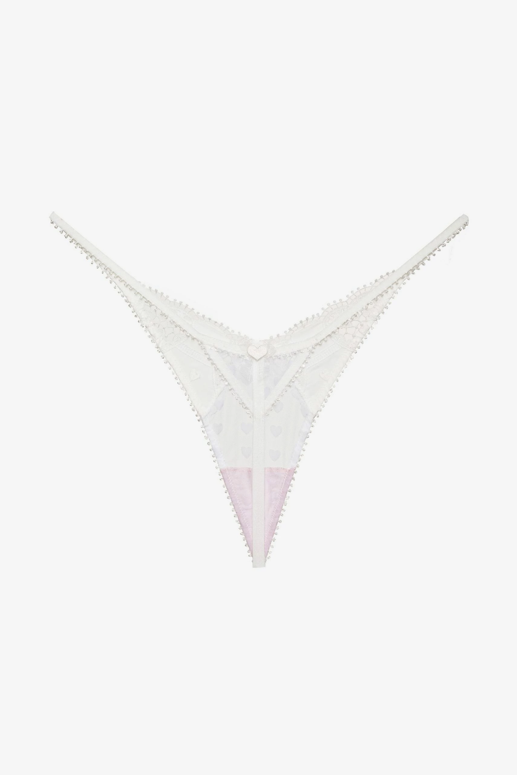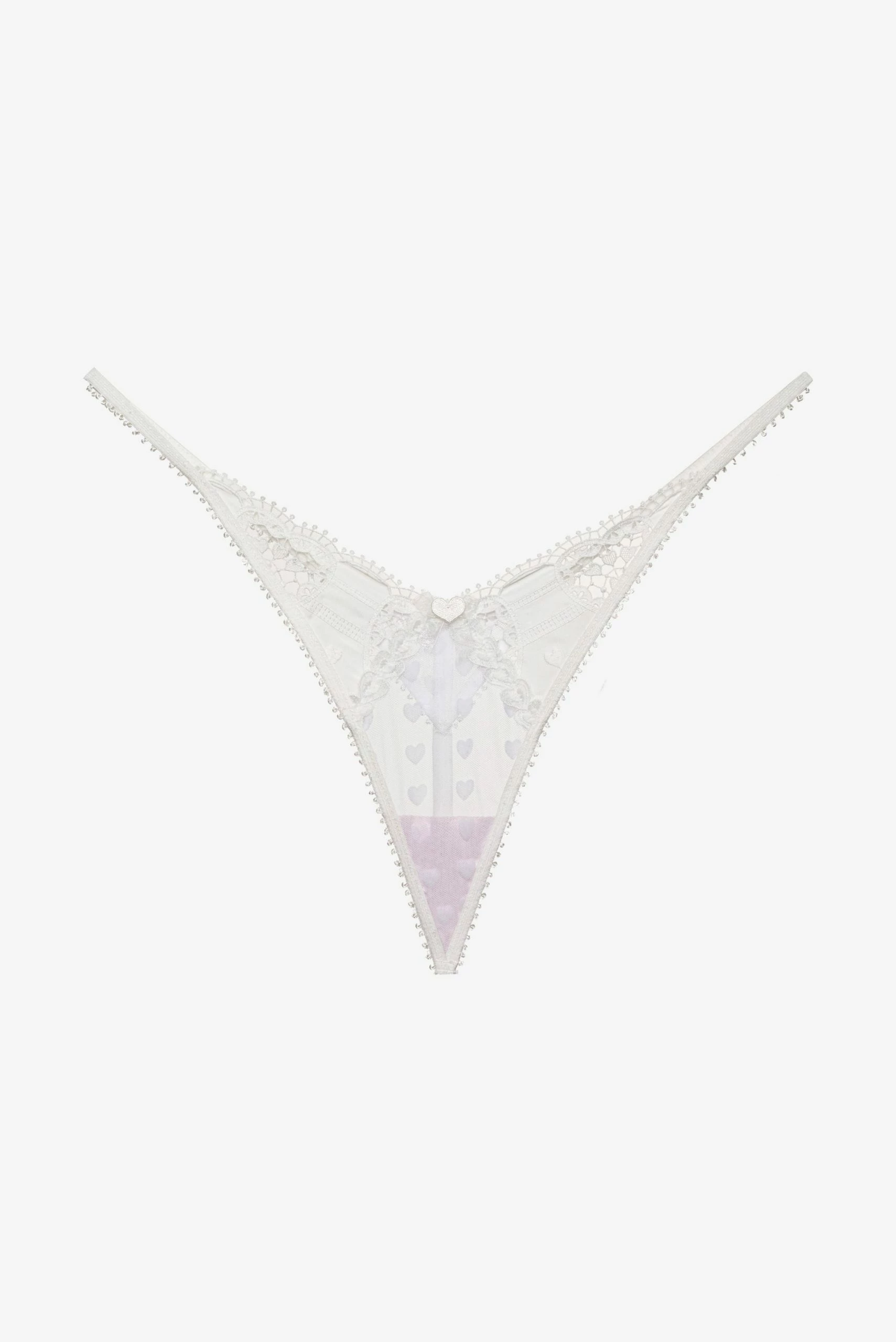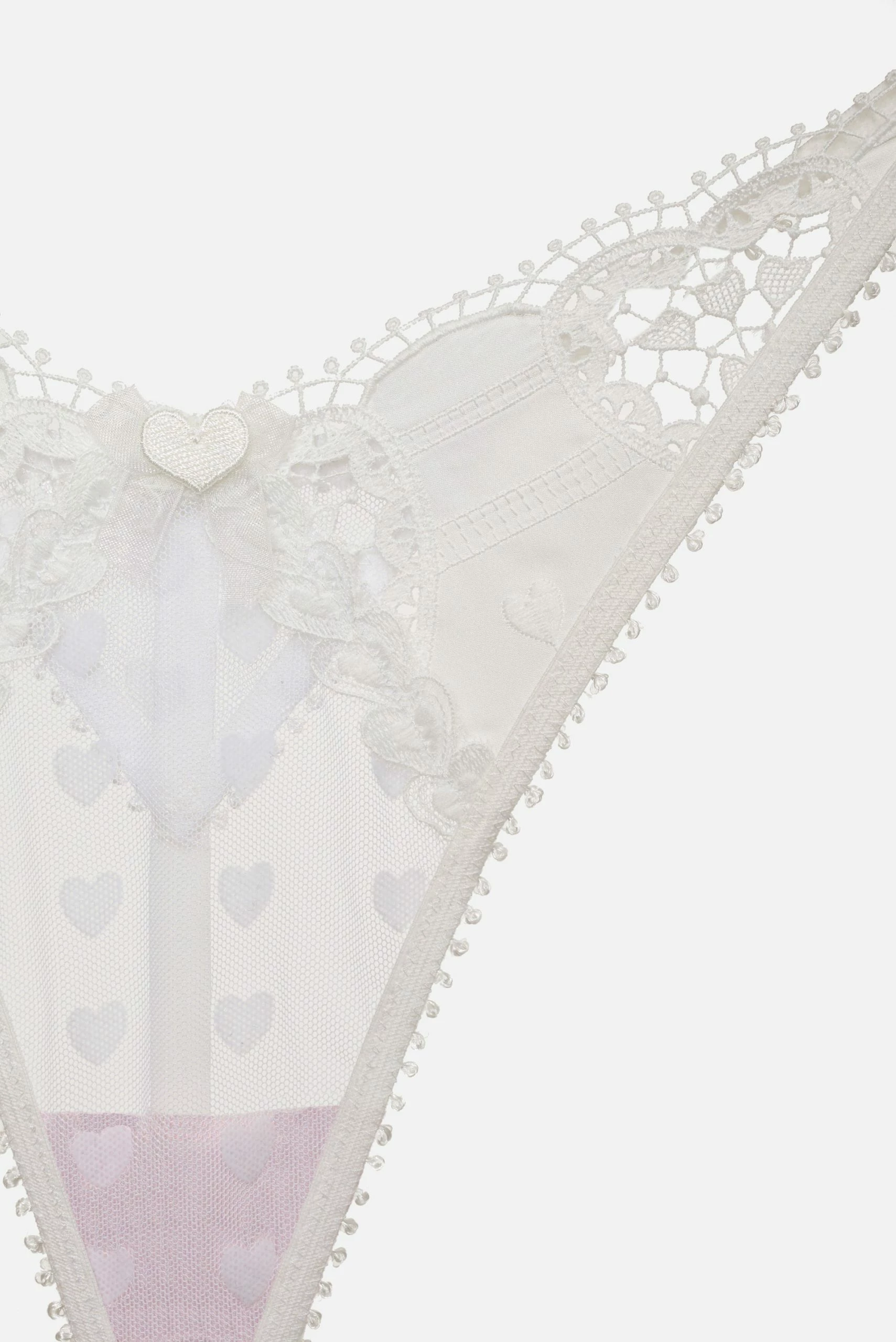 An array of heart motifs adds romantic interest to this little panty. Flocked hearts on mesh, organza bows with heart appliques, and heart-detailed lace complete the design.
