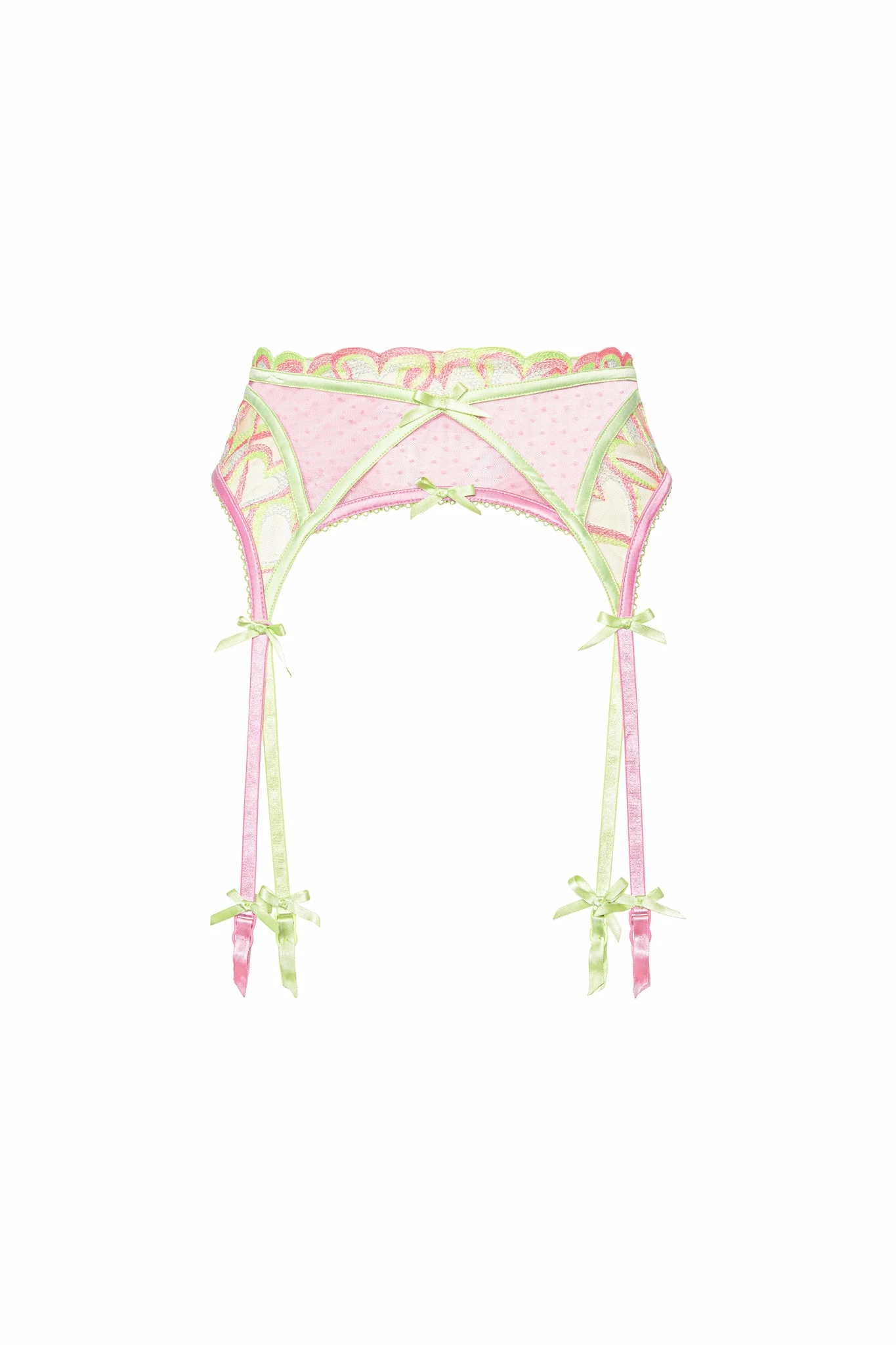 Lingerie that doesn’t skip a beat. This lovely garter belt is embroidered with interlocking hearts, which combine with panels of dotted Swiss mesh for a delicate feel. Clip on your favorite pair of thigh-highs and get ready to break hearts.