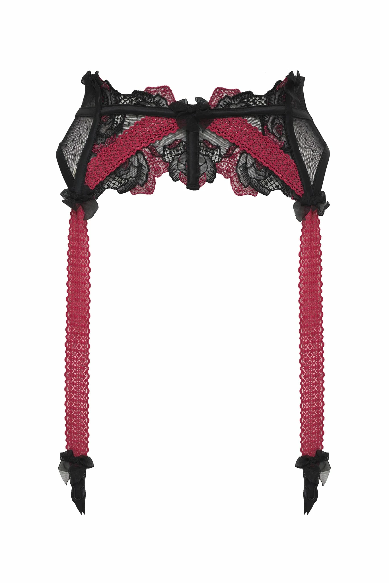 A bold color combination meets a bold silhouette on this lust-worthy garter belt featuring rose embroidery and lace straps.