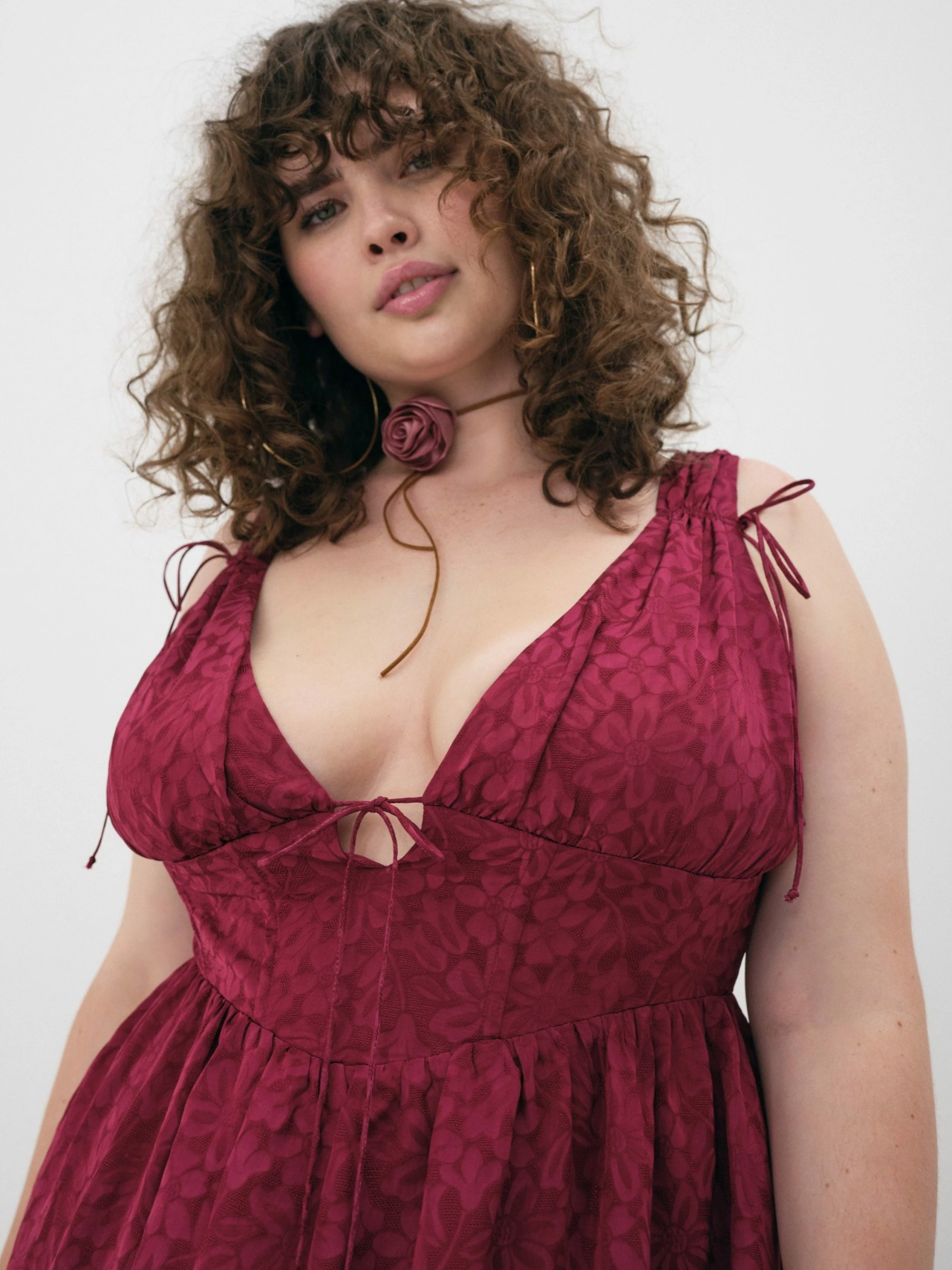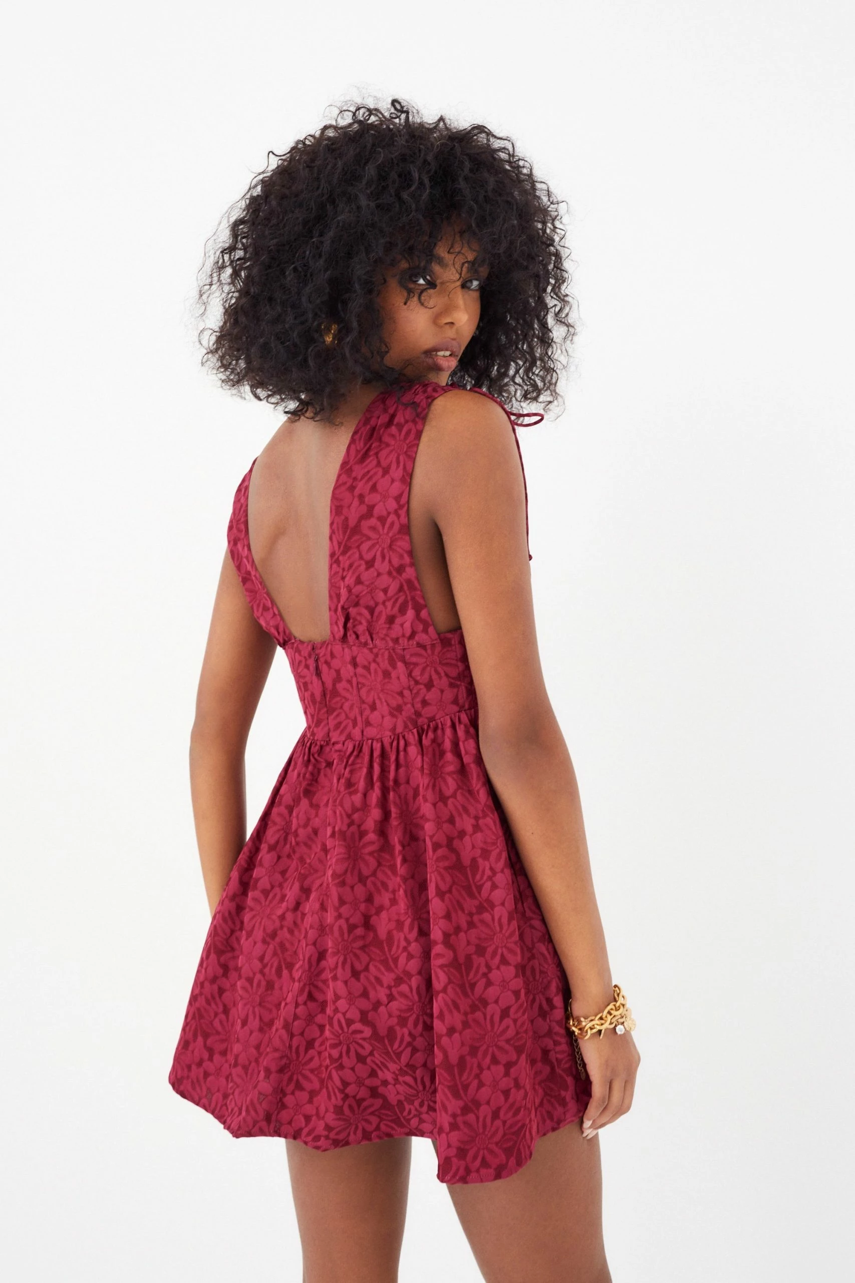 Floral jacquard mini dress with skinny string tie details at shoulders, corset detail and mini skirt with pockets.