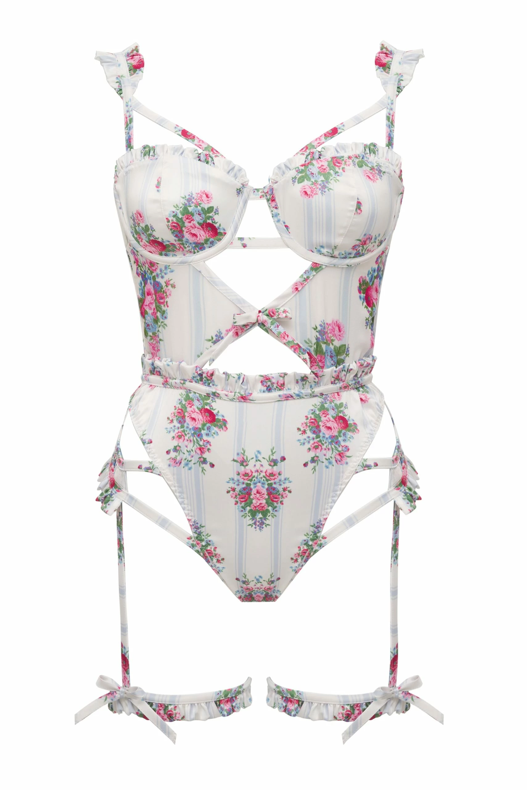 We’re smitten with this vintage-inspired, Victorian-floral print. As seen on a romantic teddy with pin-tucked details, ruffles, and peekaboo accents throughout. Ribbon bows and frilly garters finish the look.