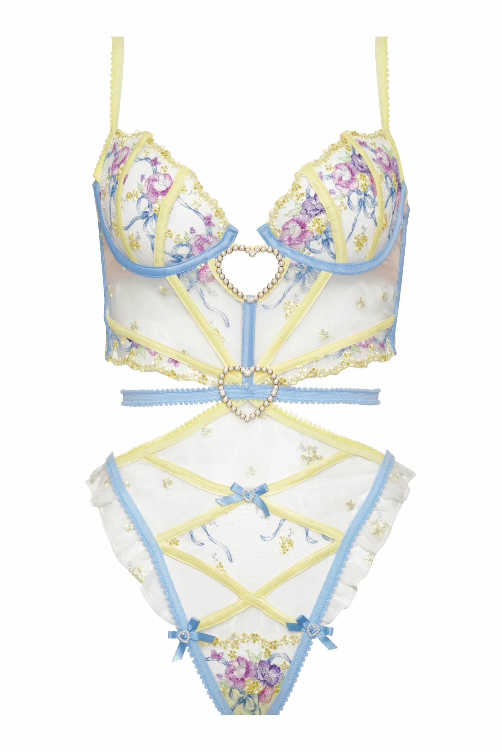 Soft pastel colors, floral embroidery, and pearly hearts lend this detailed one piece a romantic air. Cutouts and strappy details add a little edge.