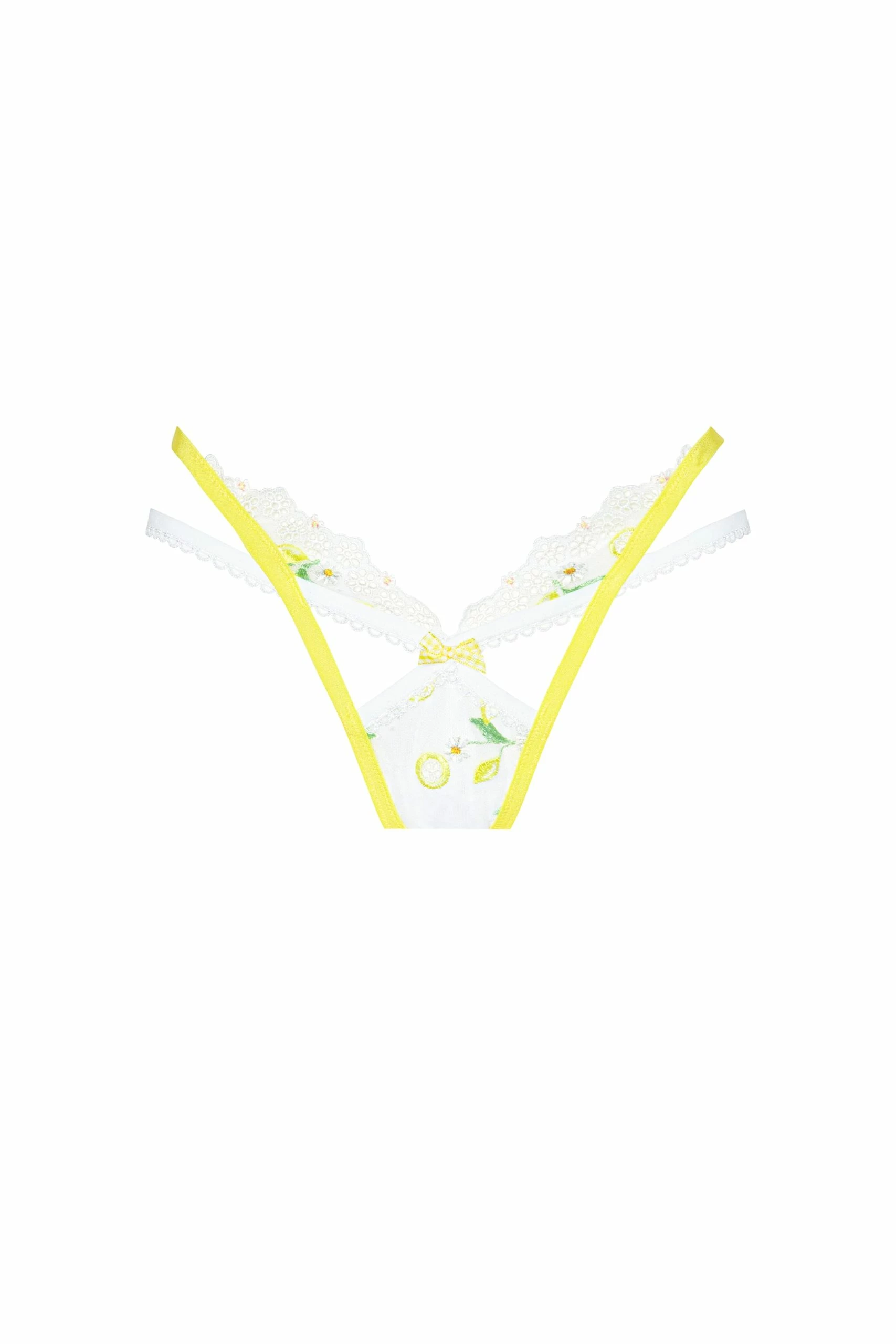 Squeeze some freshness into your top drawer. Lemons mix with daisies for a sweet twist on embroidery—as featured on an alluring thong with scalloped eyelet lace, peekaboo cutouts, and double-string sides.