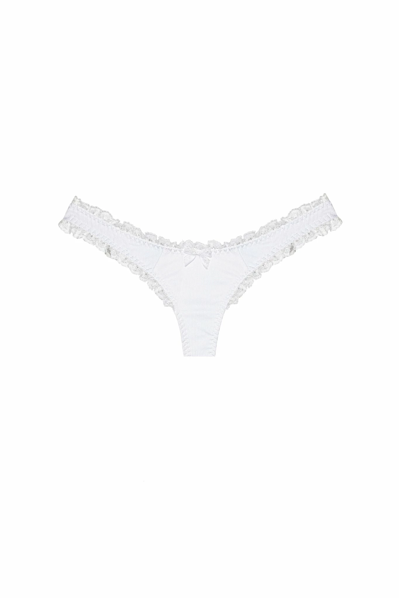 Dreamy ribbed high-cut thong featuring scalloped lace trim.