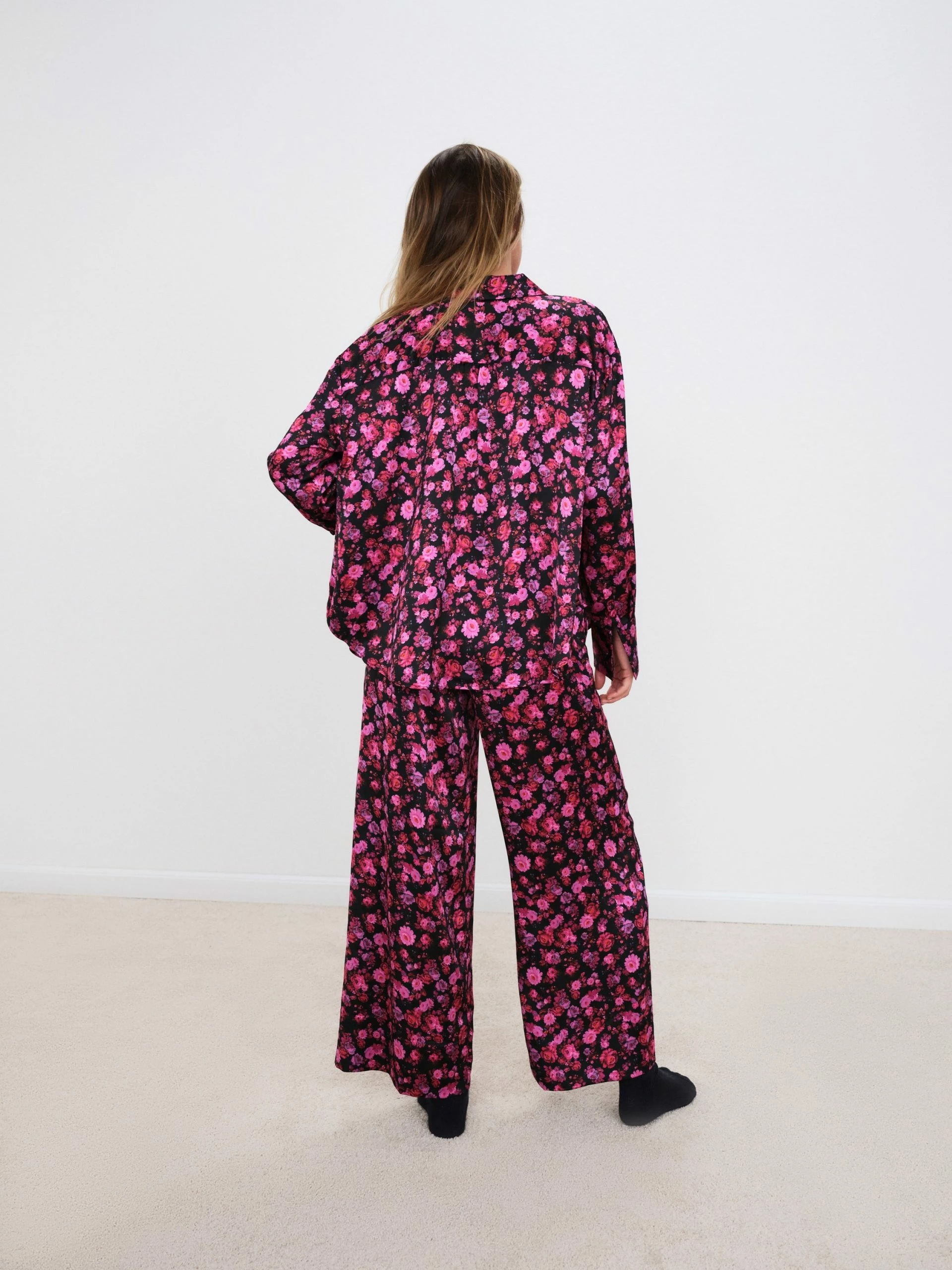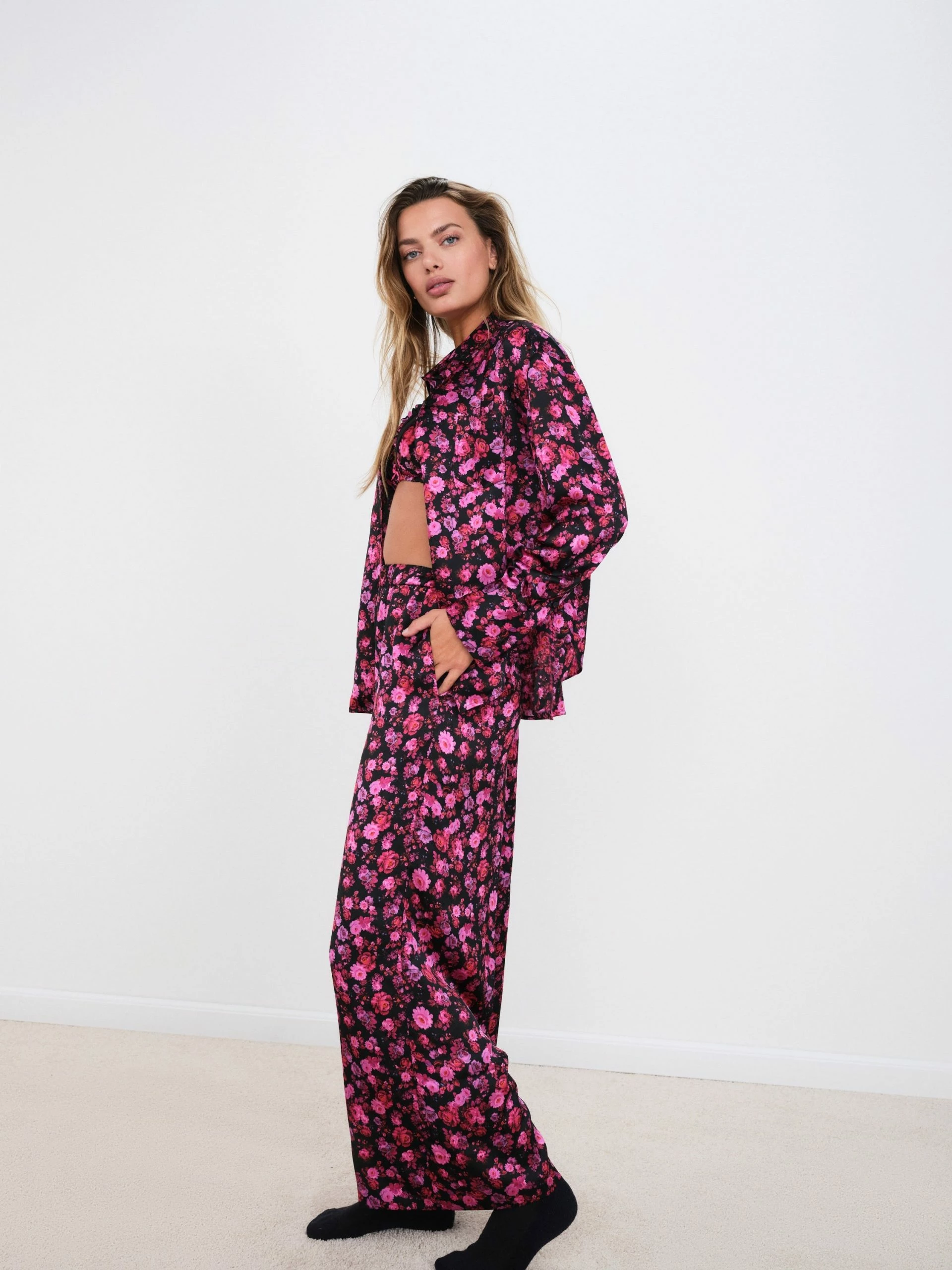 Flirty in shocking shades of pink and purple—these sumptuous satin pajama bottoms feature a wide leg and allover floral pattern. Meant to be paired with the matching top.
