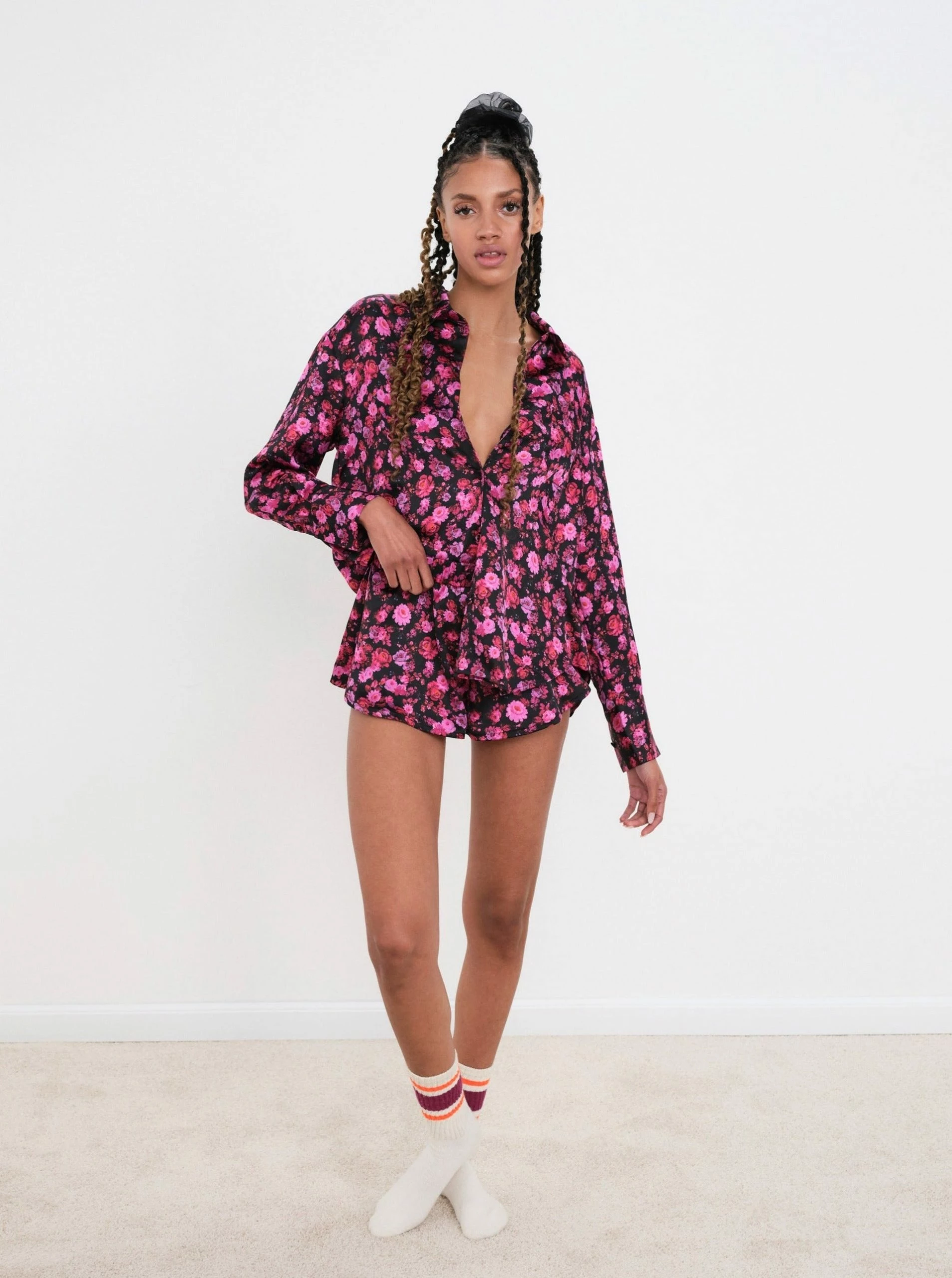 Flirty in shocking shades of pink and purple—these sumptuous satin pajama shorts feature a comfy fit and allover floral pattern. Meant to be paired with the matching top.