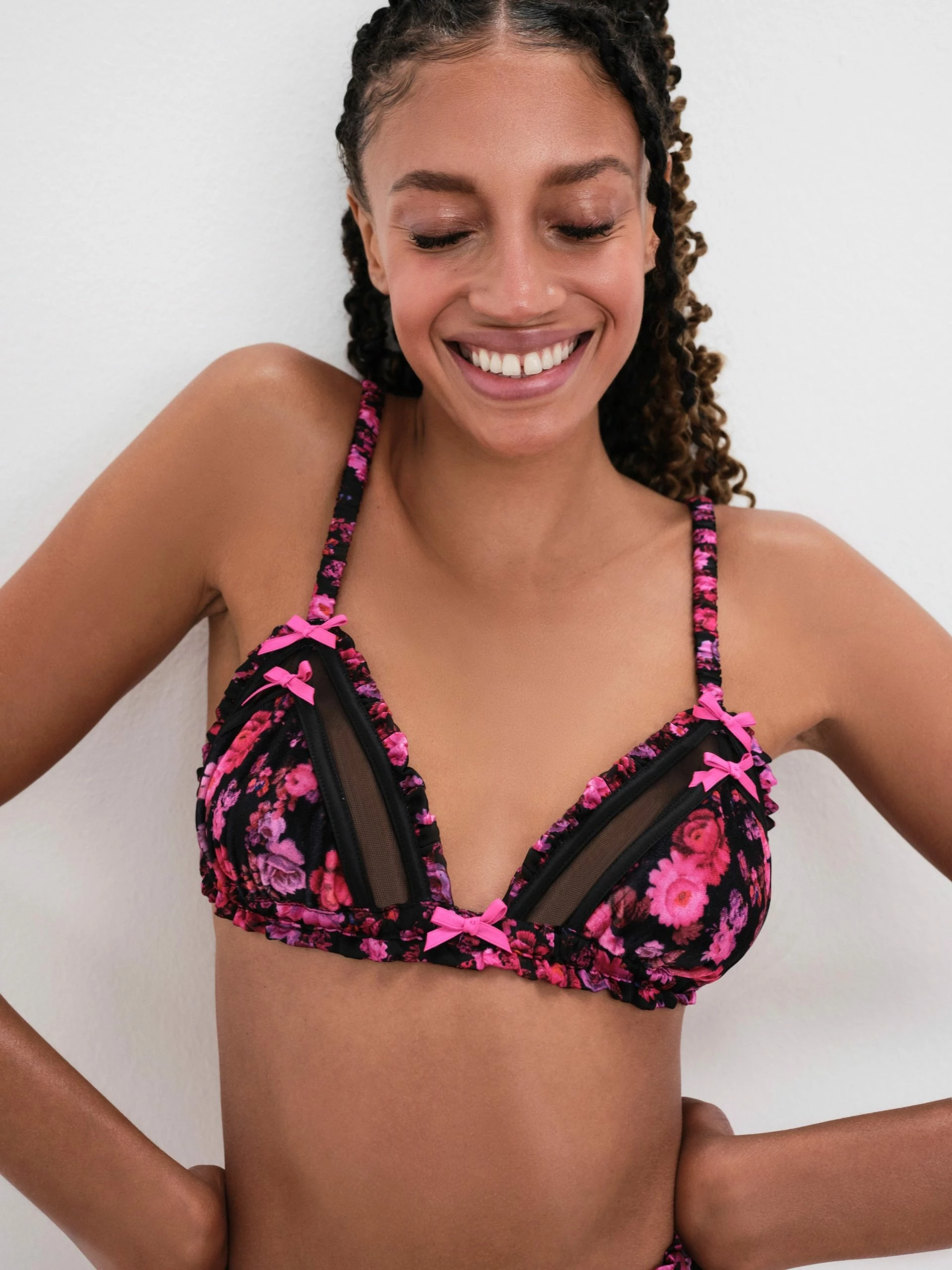 Flirty in shocking shades of pink and purple—this floral bralette features ruffled trim, satin bows, and sheer insets on the cups.