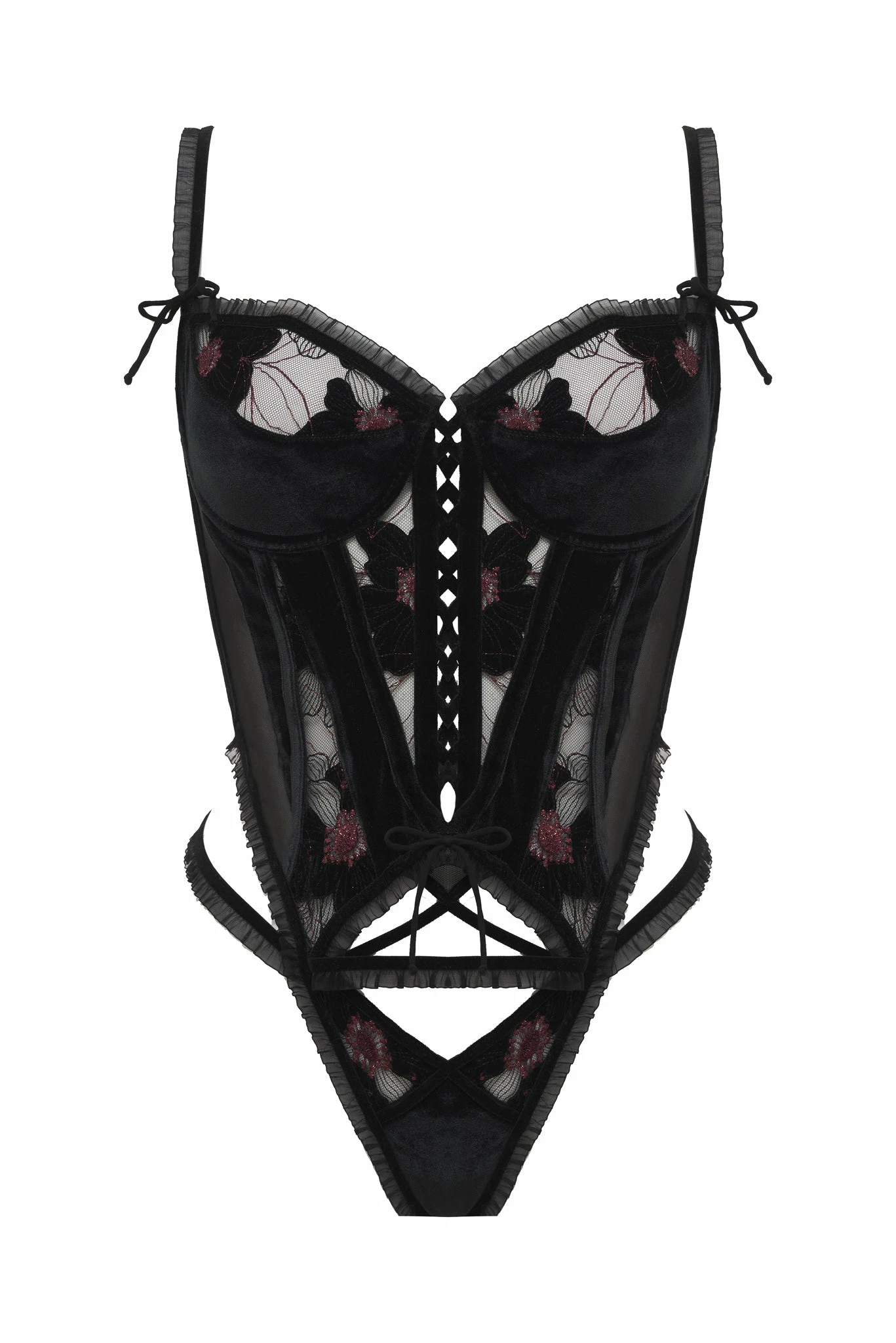 It doesn’t get more seductive than the combination of black lace and velvet. As seen on an embroidered teddy featuring strappy accents, ruffle trim, and lace-up details.