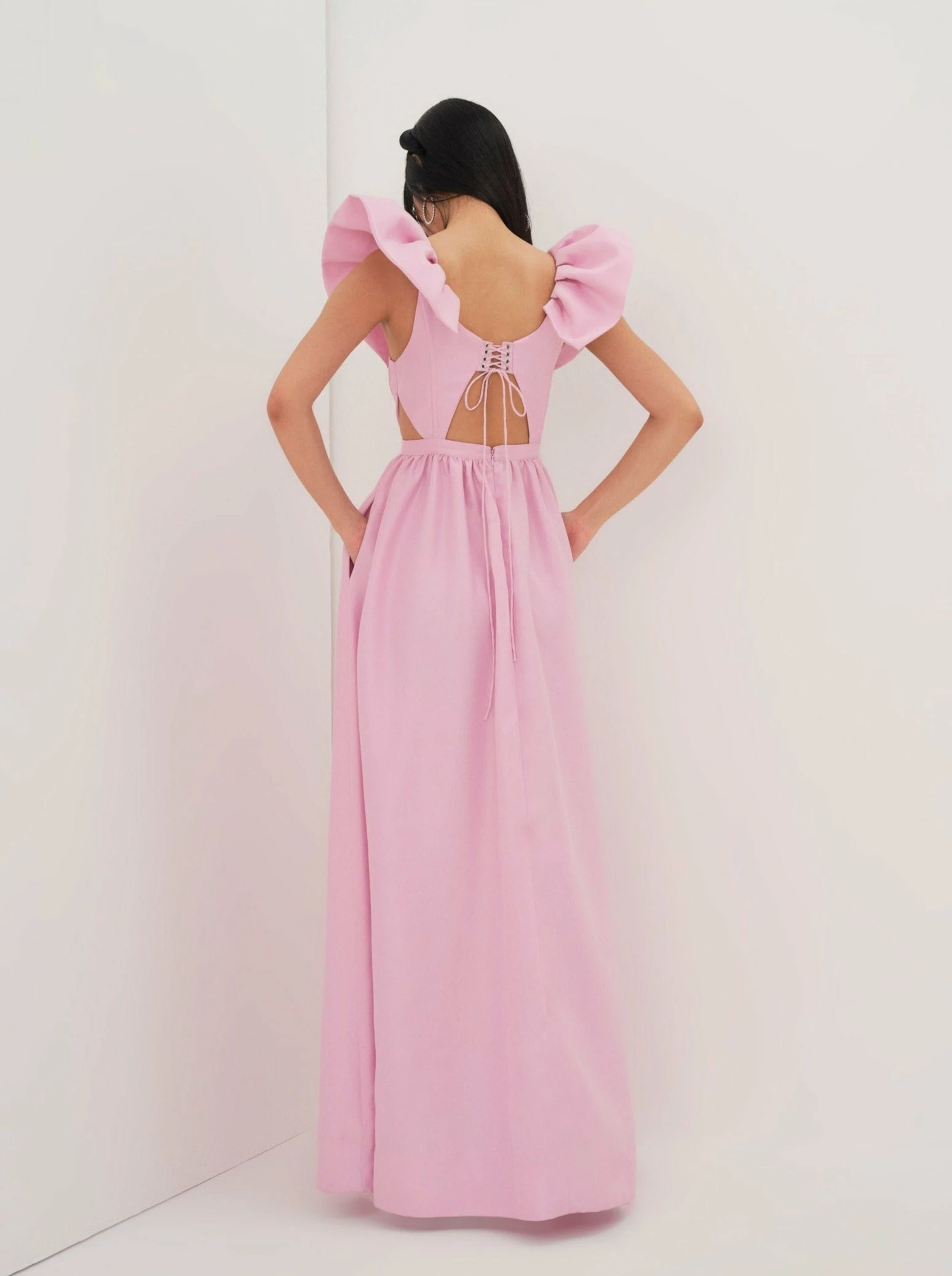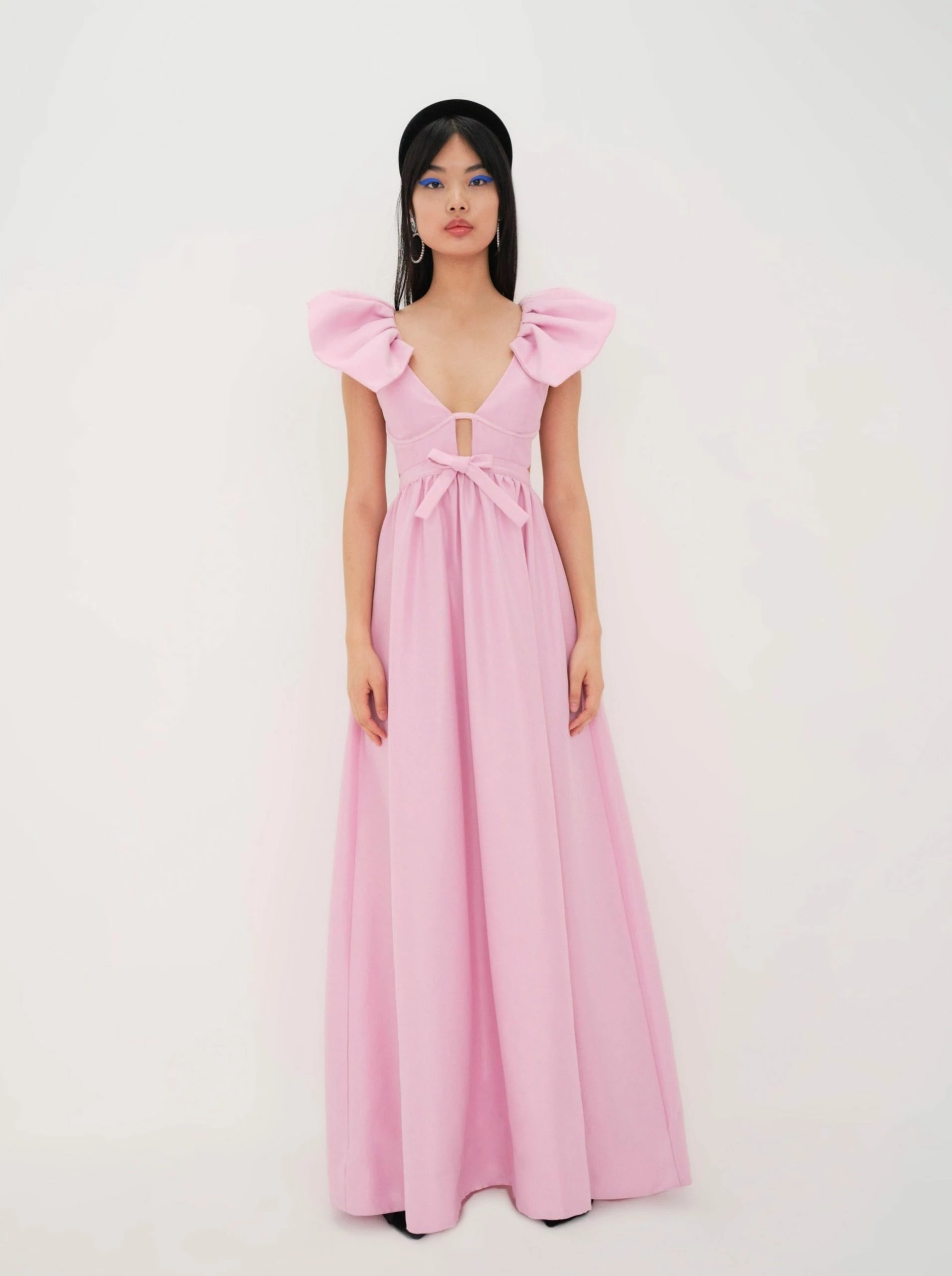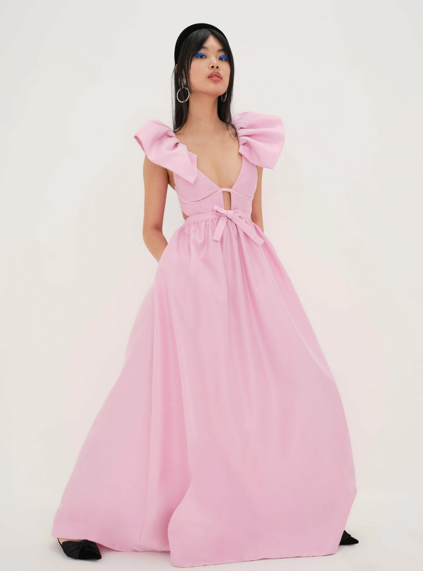 The definition of pretty in pink. Sculptural sleeves and a dramatic, long skirt (with pockets) make a high fashion statement in matte satin.