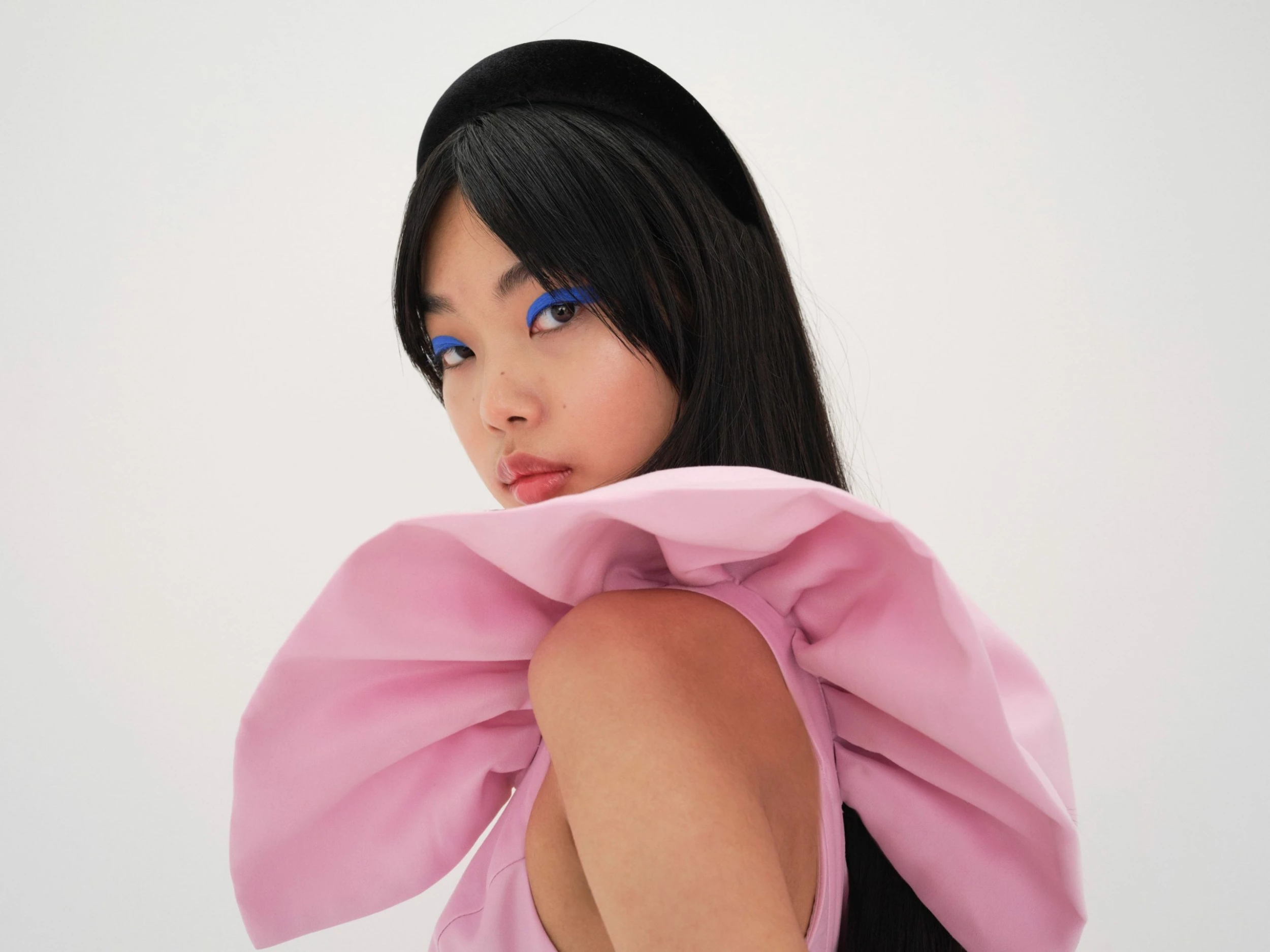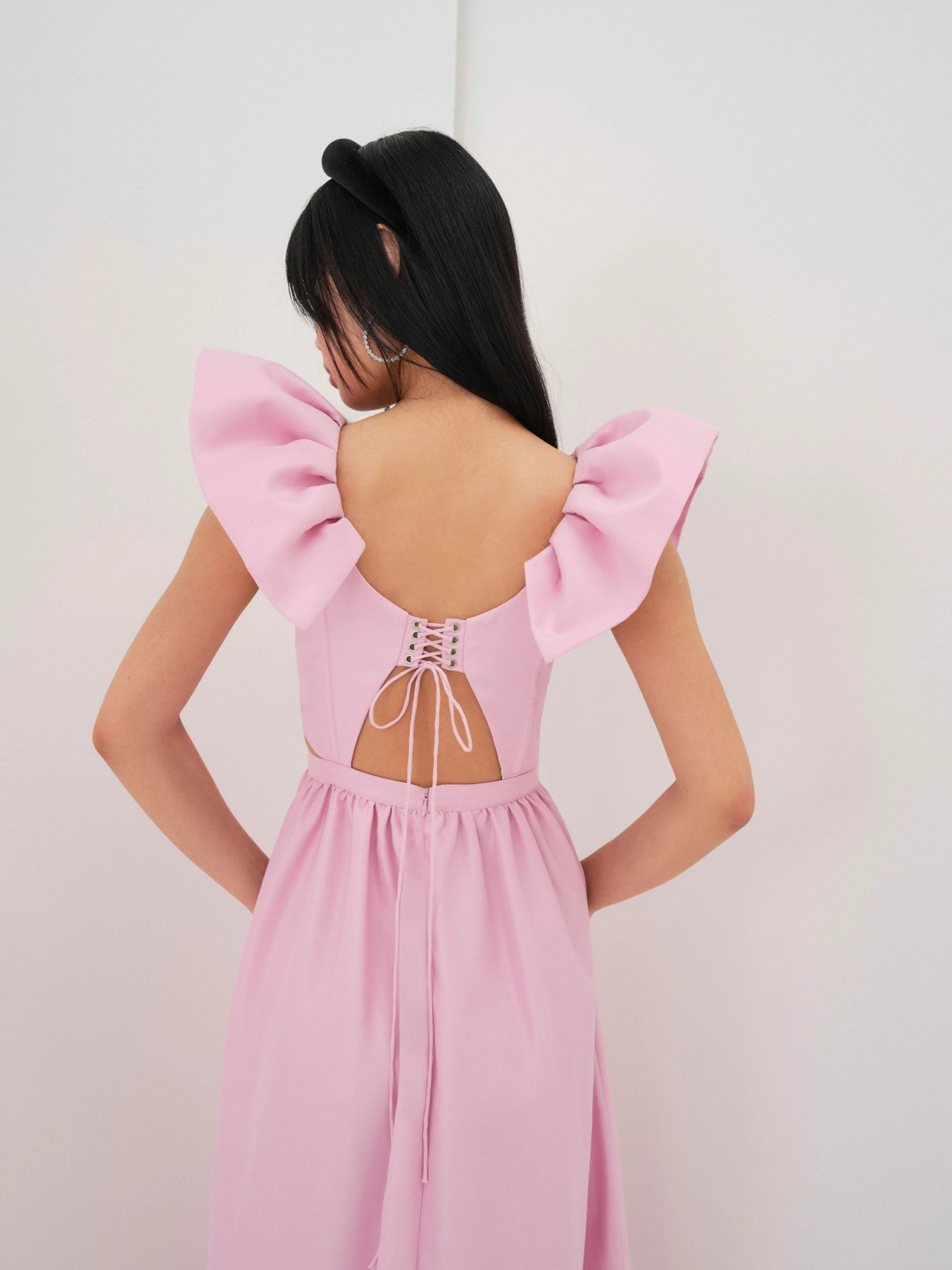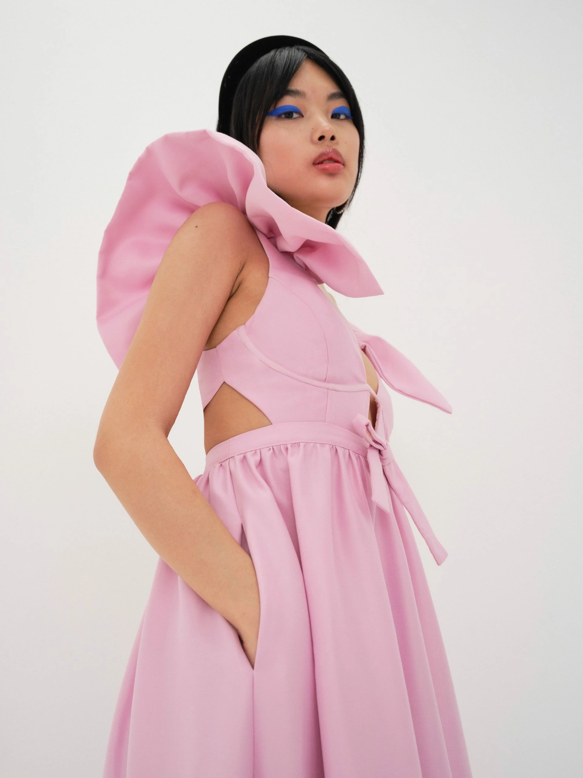 The definition of pretty in pink. Sculptural sleeves and a dramatic, long skirt (with pockets) make a high fashion statement in matte satin.