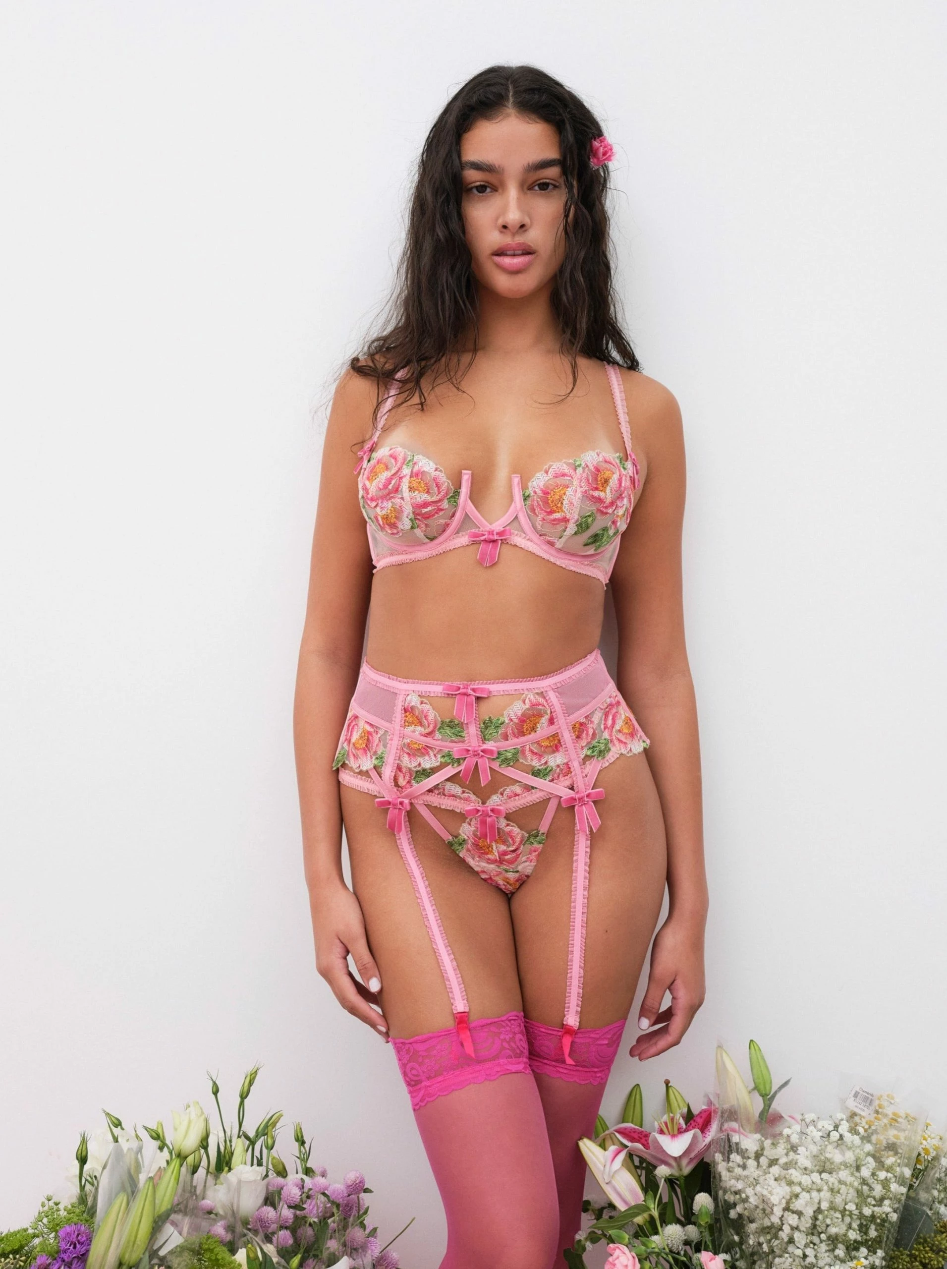 Everything’s coming up roses. Blooming with lush embroidery, velvet bows, and ruffled elastic, this one is a fresh pick.