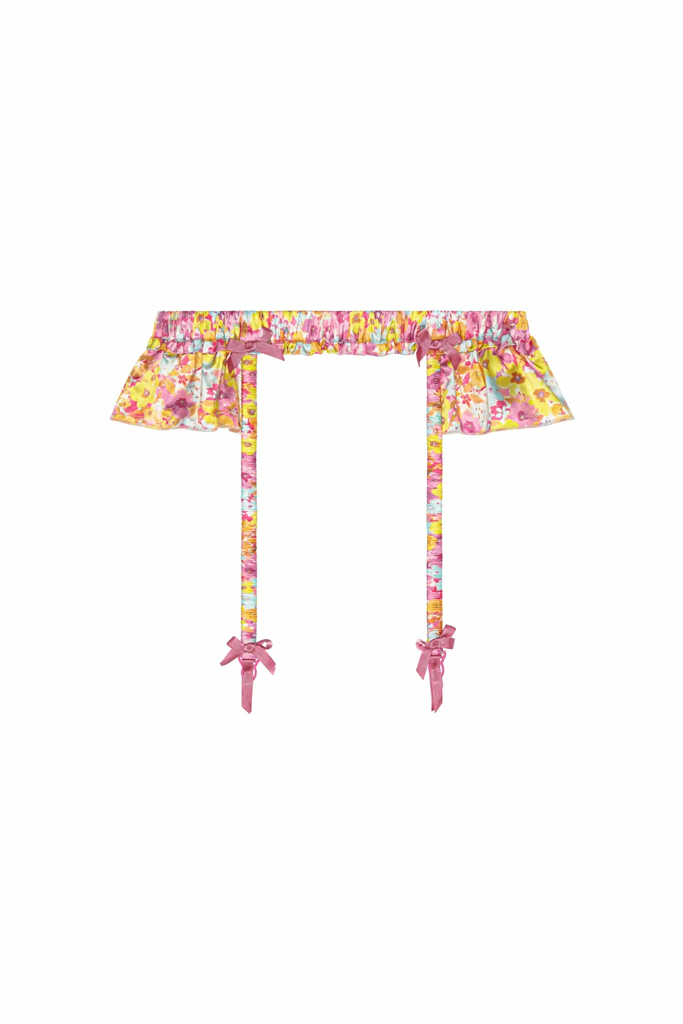 The sweetest thing about this this flirty satin suspender belt? It’s difficult to choose between the cheerful floral print, bow accents, and shirred ruffles at the hips, waistband, and straps that attach to your favorite stockings.