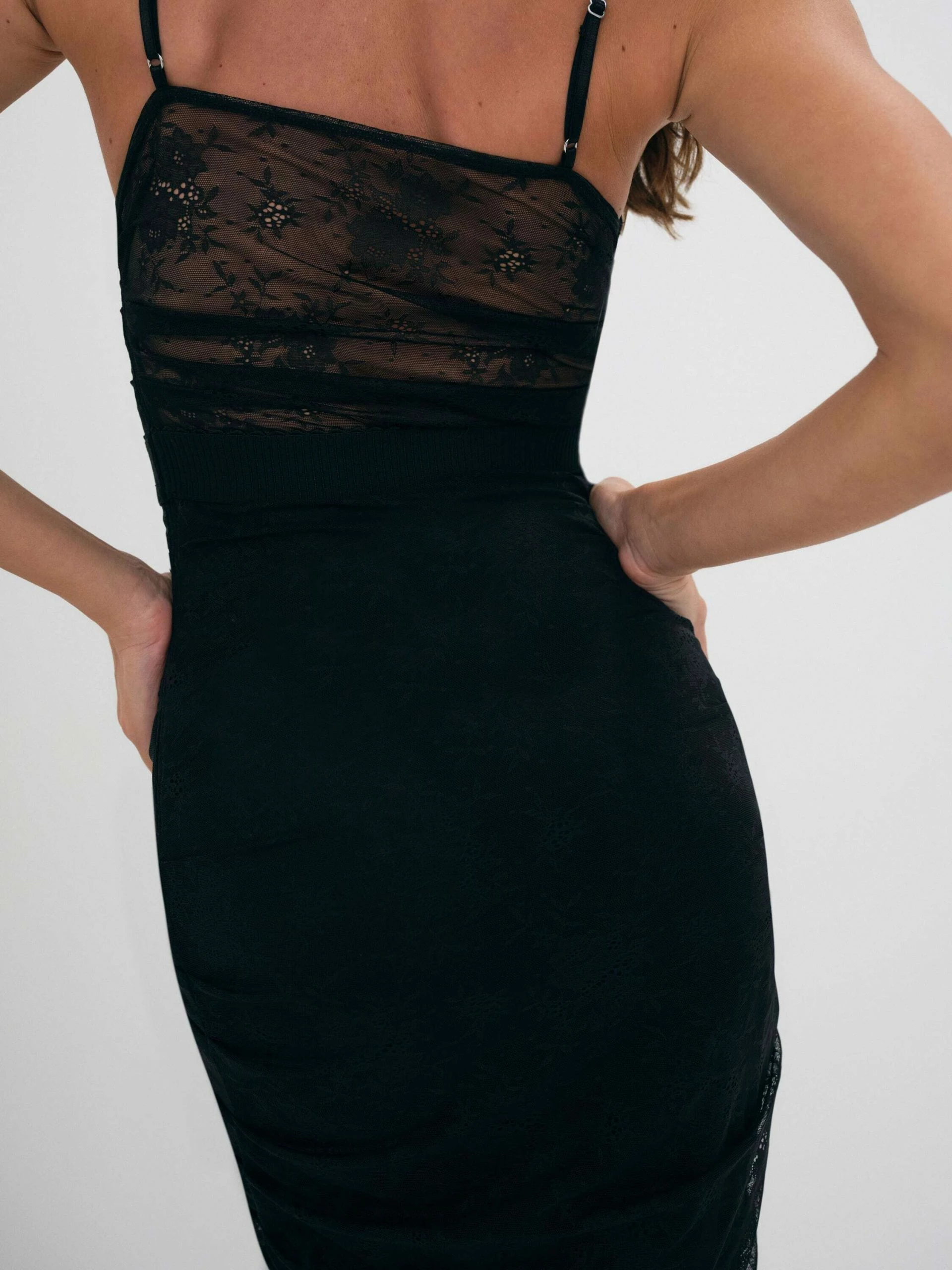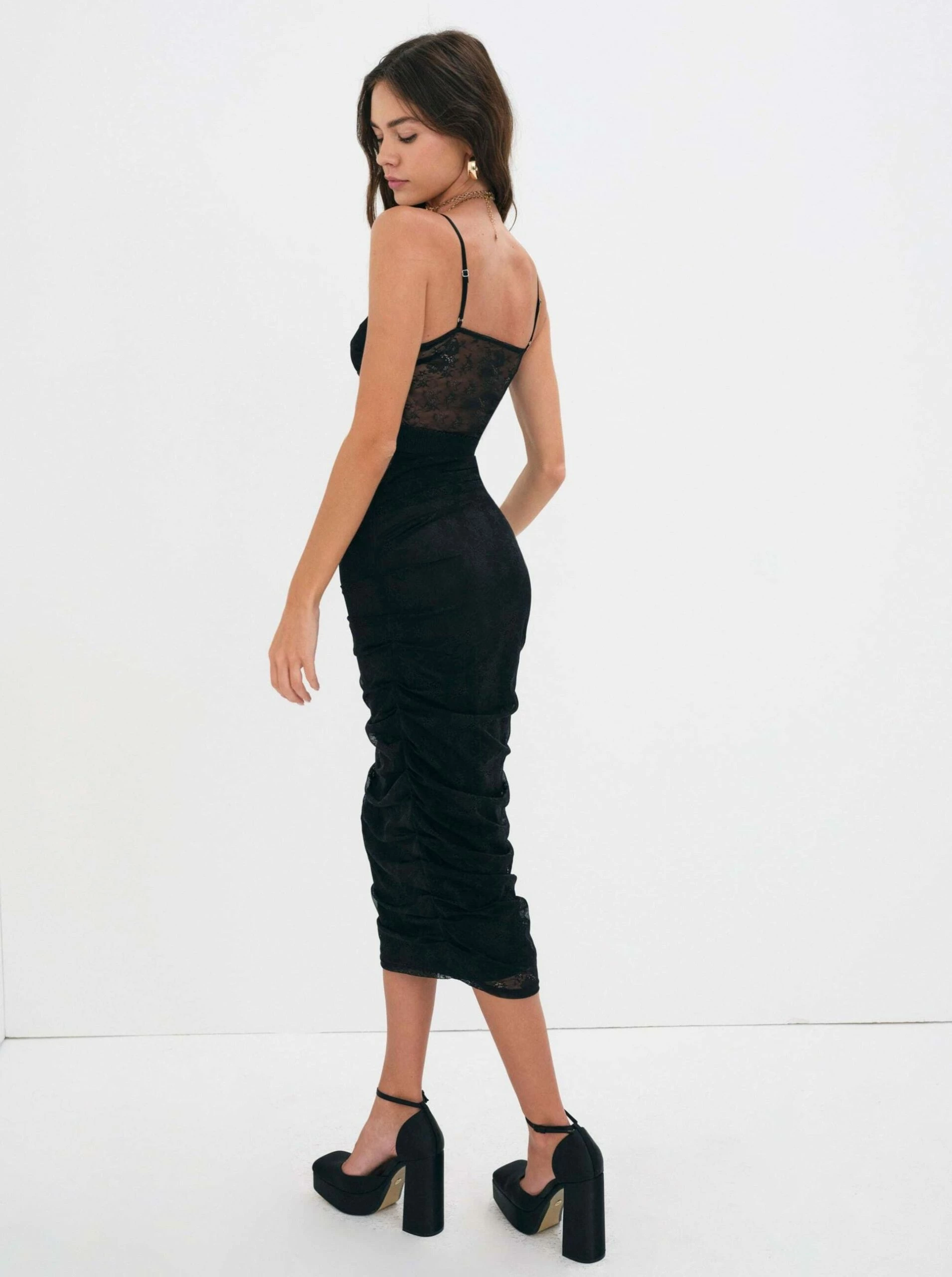 Nothing beats a good cutout. The Poison Ruched Dress is made out of stretch jacquard lace, and features a scalloped elastic waistband, a front bodice cutout with a functional drawstring at bust.