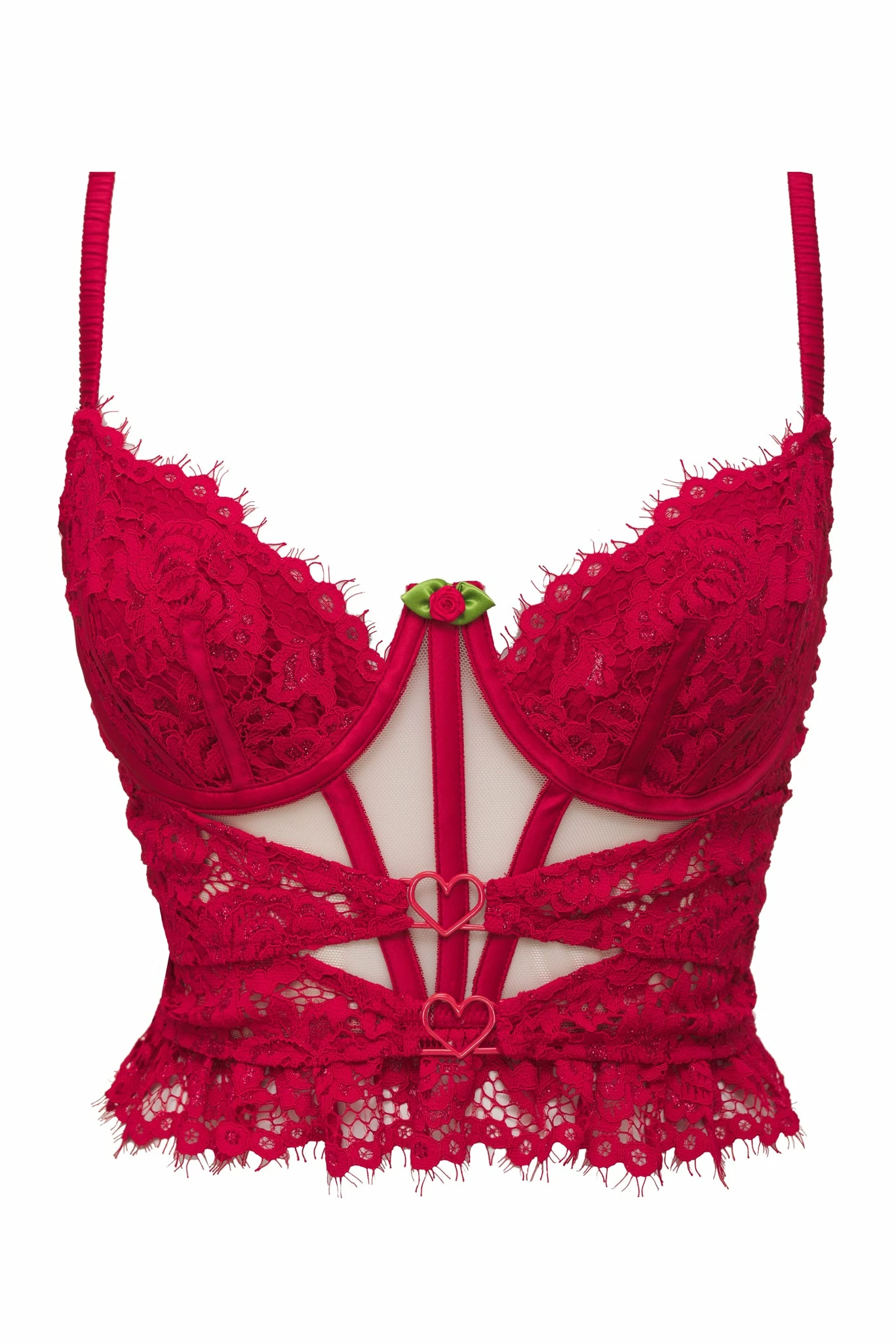 Go ahead, show off with red lace and exquisite details including: peekaboo accents, a low open back, and enamel heart details. Finished with a sweet satin rosette front and center.