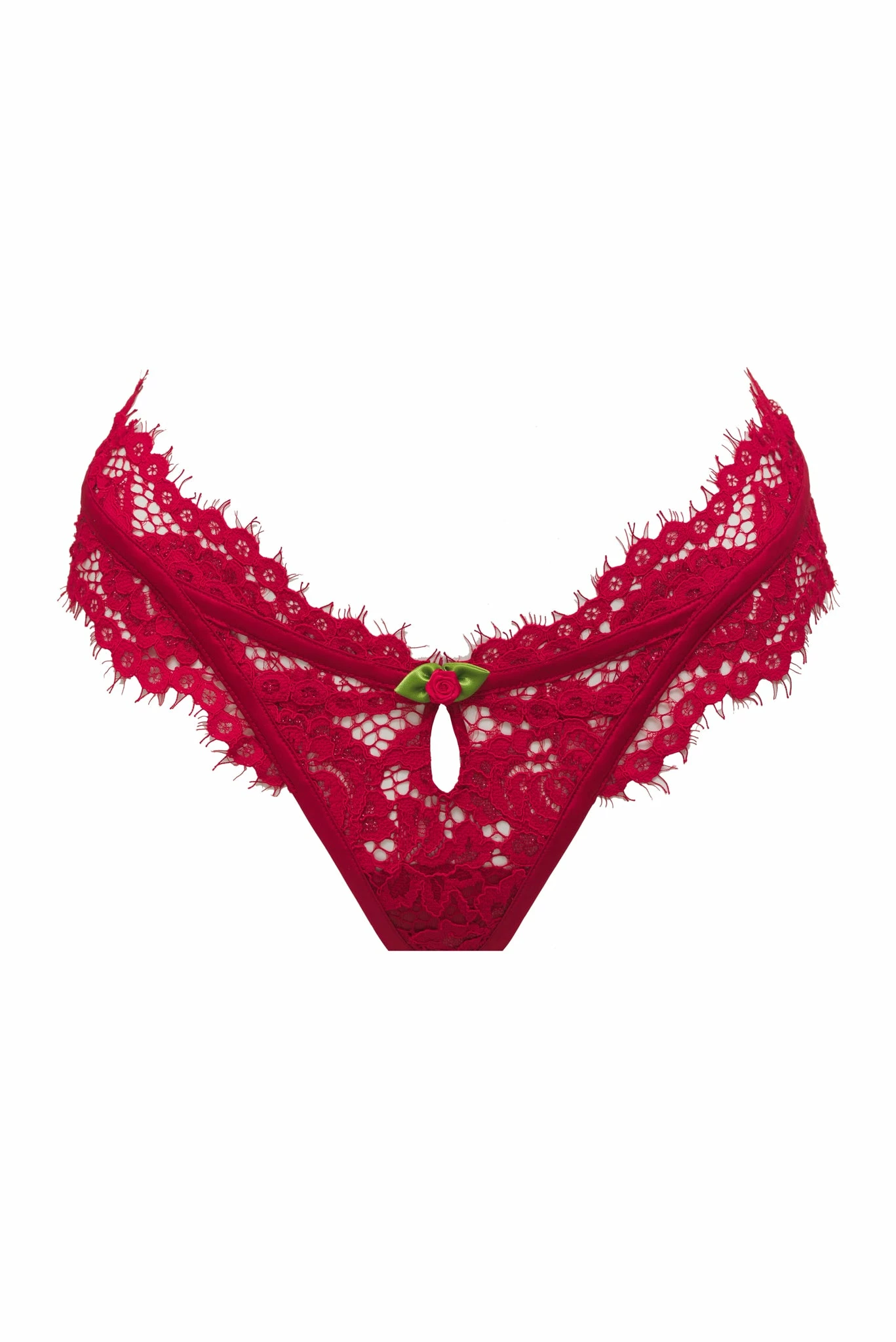 Go ahead, show off in red lace with exquisite detail and defined with sexy accents, from the scalloped lace and satin rosettes to the keyhole front and triangle back cutouts.
