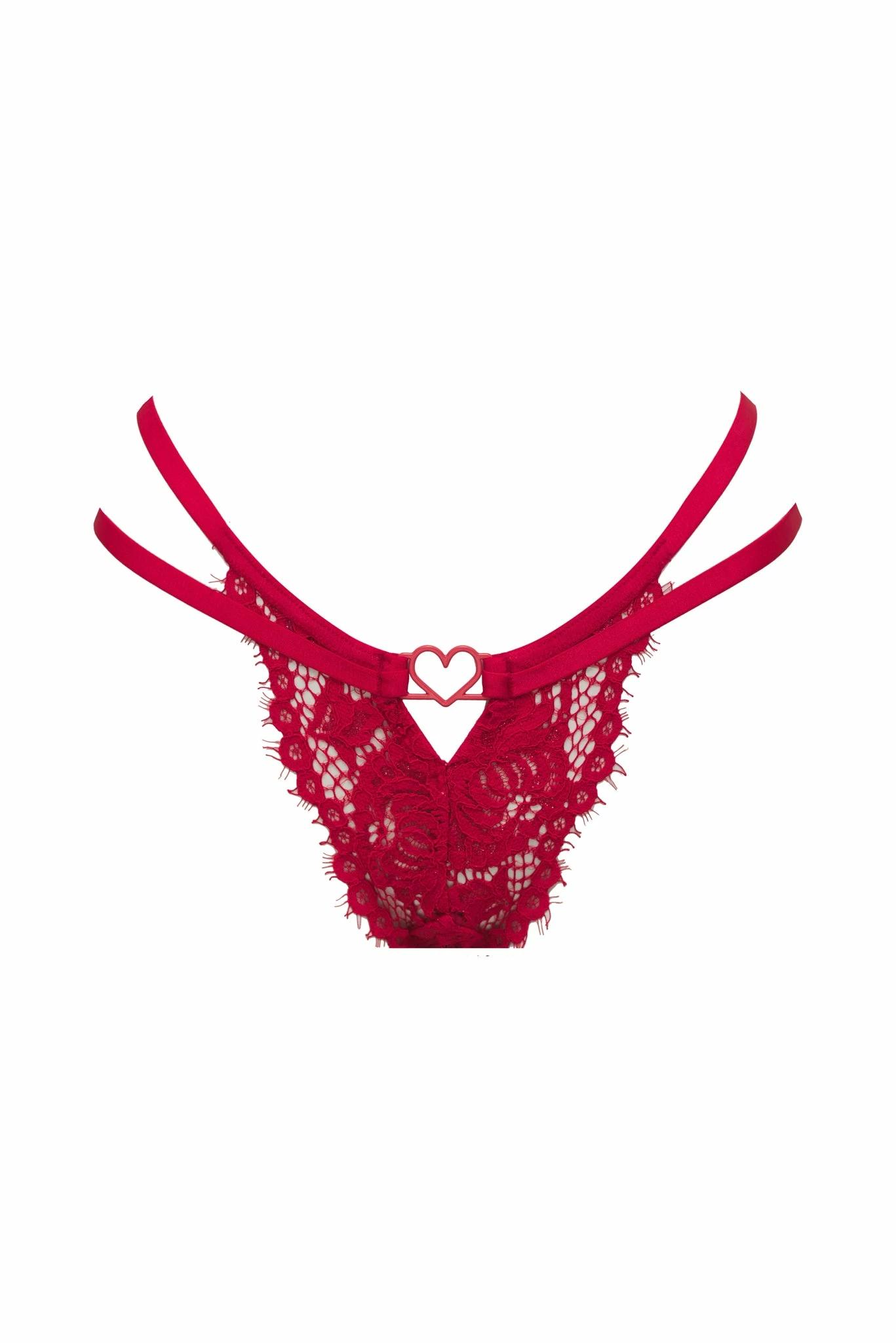 Go ahead, show off with red lace and exquisite detail. Defined with delicate accents, from double satin hip straps to a small keyhole in front. Enamel hearts, front and back, set it off.