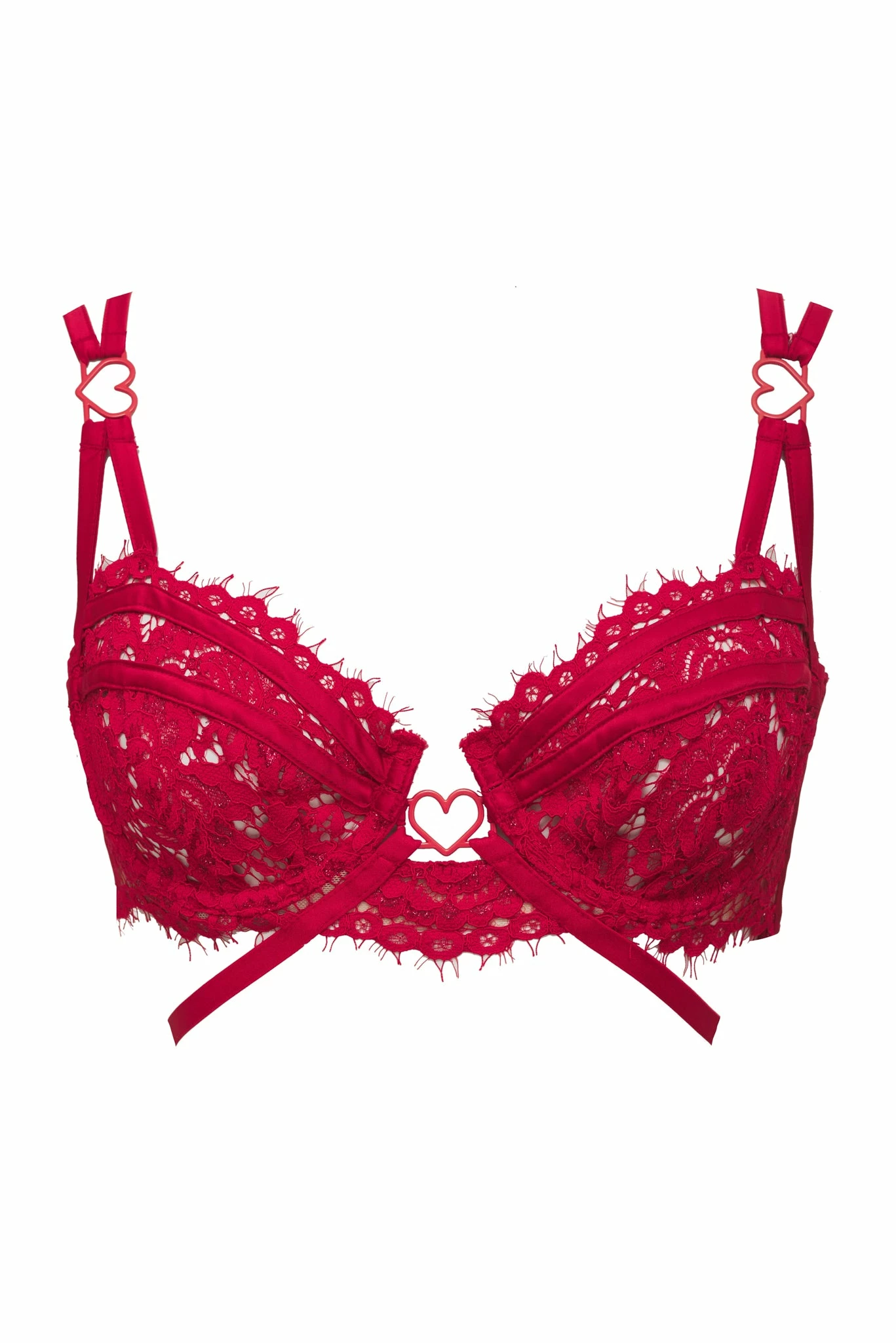 Go ahead, show off in red lace with exquisite detail. Featuring strappy sides and enamel heart accents, this showstopper makes a statement.