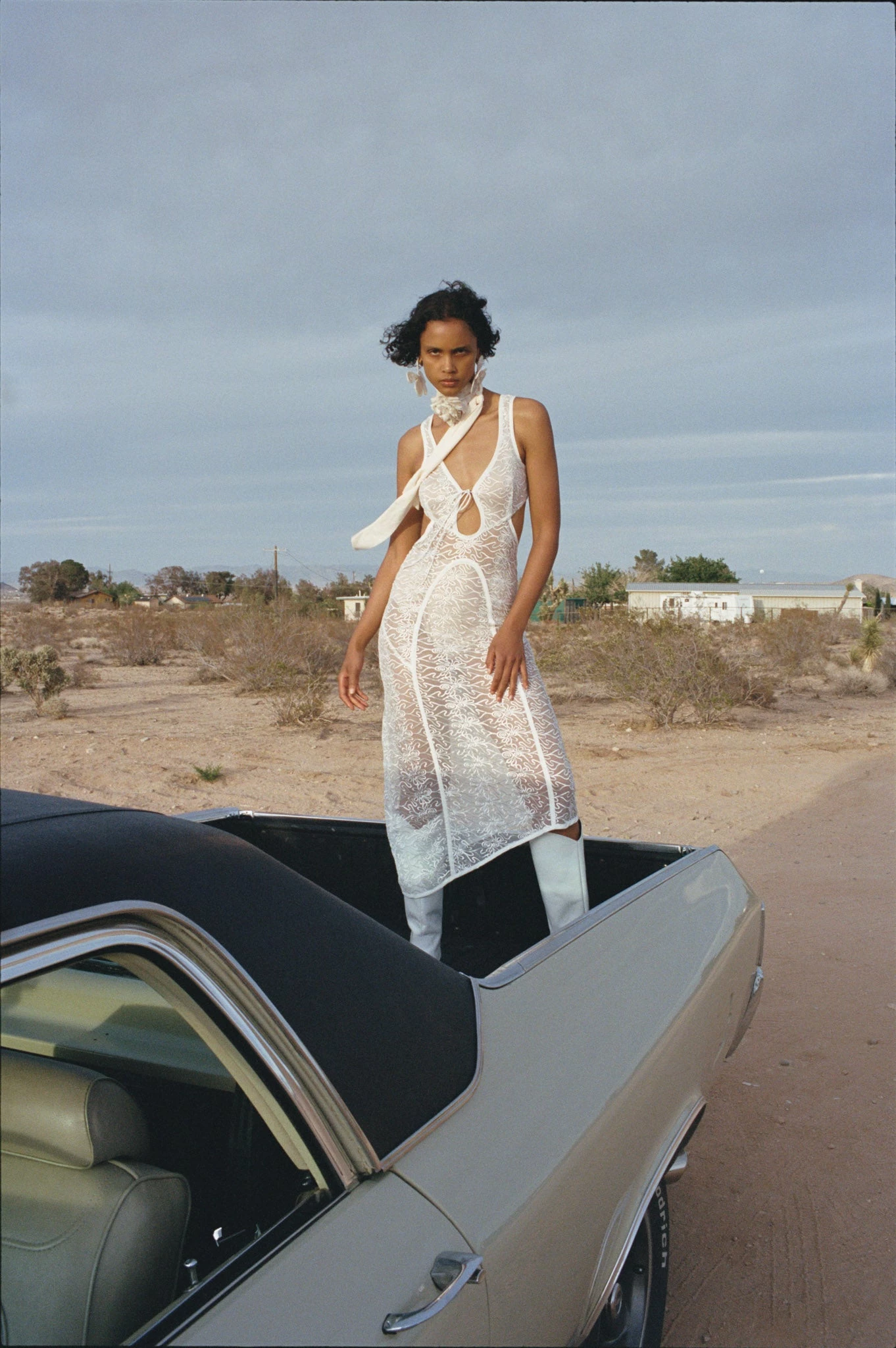 Soutache embroidery tulle dress with curved satin taping throughout and keyhole with tie at neckline.