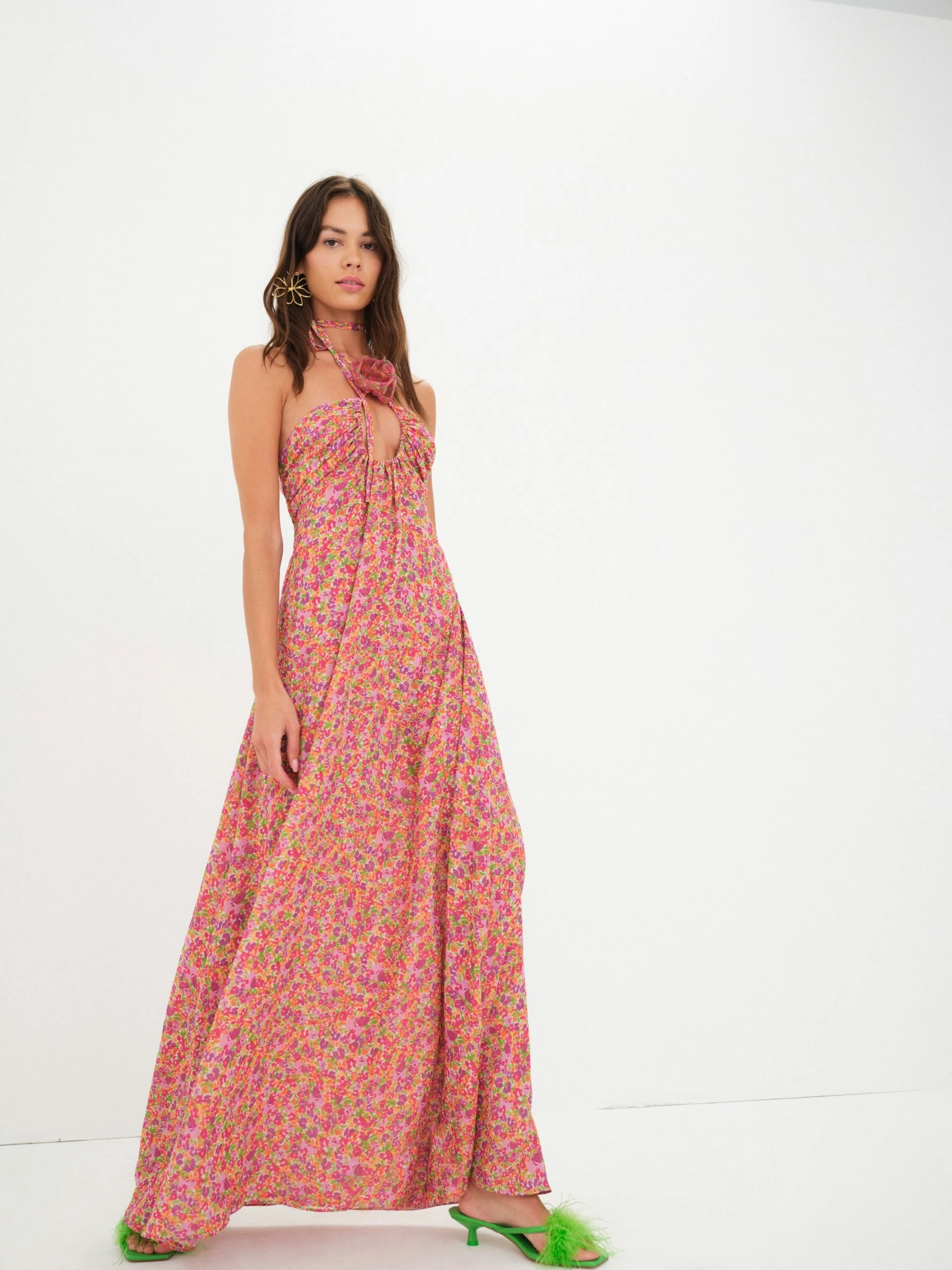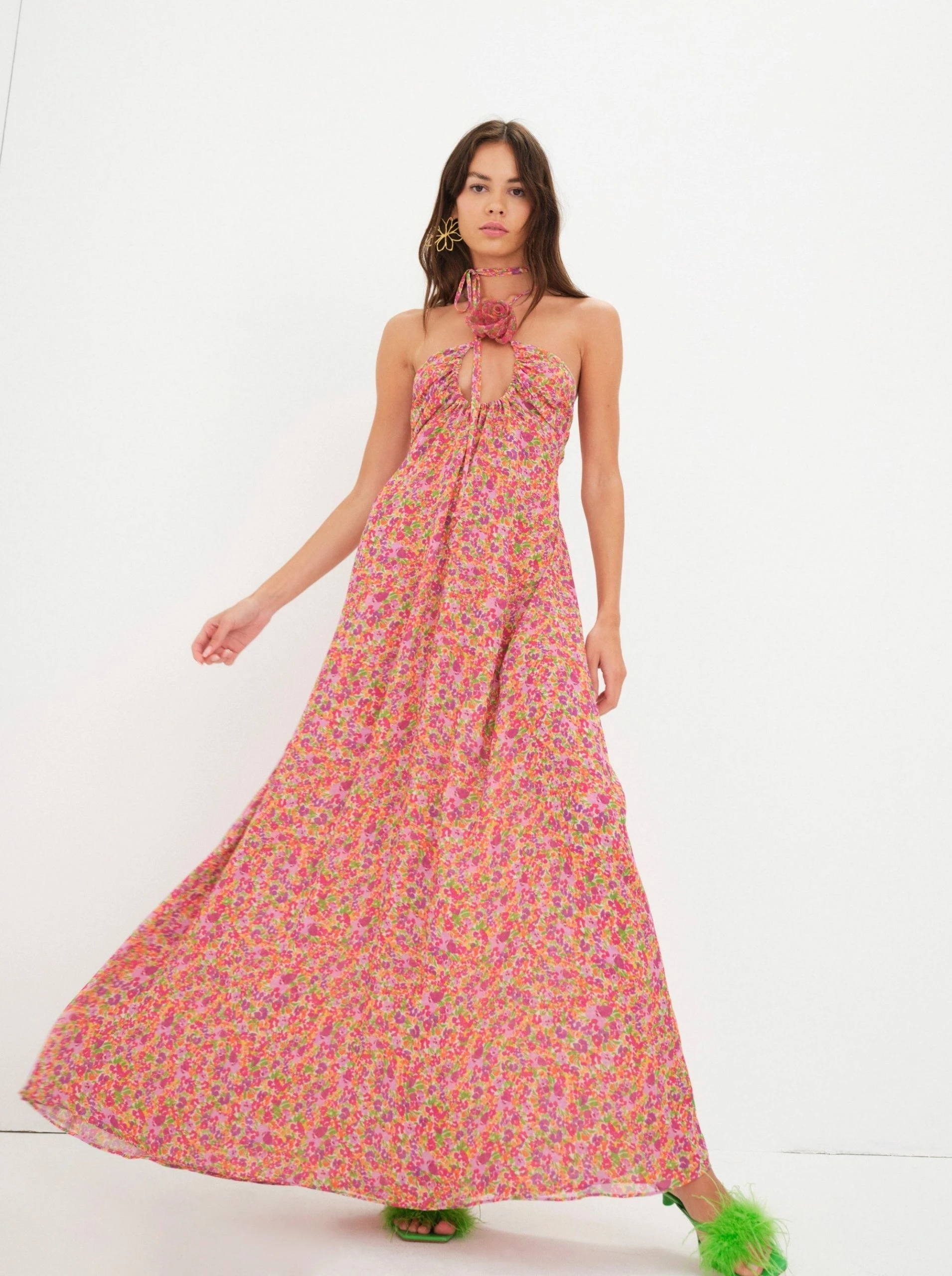 Main character rom-com energy. Ditsy floral chiffon maxi dress with rosette ties along neckline and adjustable gathered keyhole at chest.